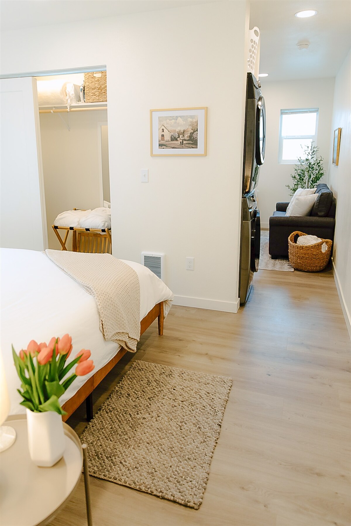 This bright and cheerful space includes a full sized - stocked kitchen with coffee service, a dining area, living area w/sleeper sofa and a half bath. A dedicated in unit washer and dryer, WiFi & Smart TV in the living area ready for your own Firestick, or use included Netflix, Disney, Amazon, and YouTube TV. Charming separate bedroom with a queen bed, and full bath with sliding door to a private patio awaiting your morning or evening downtime!