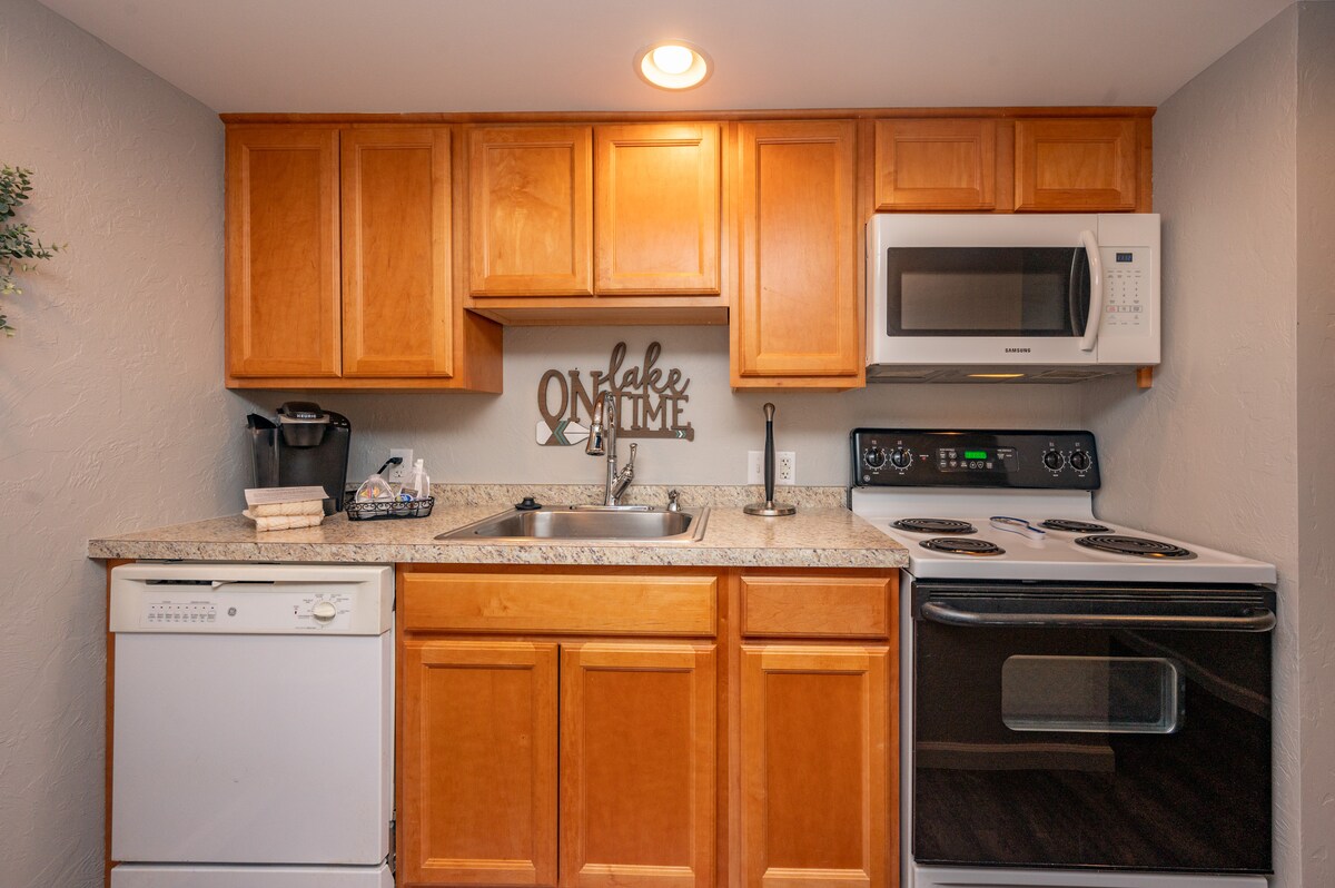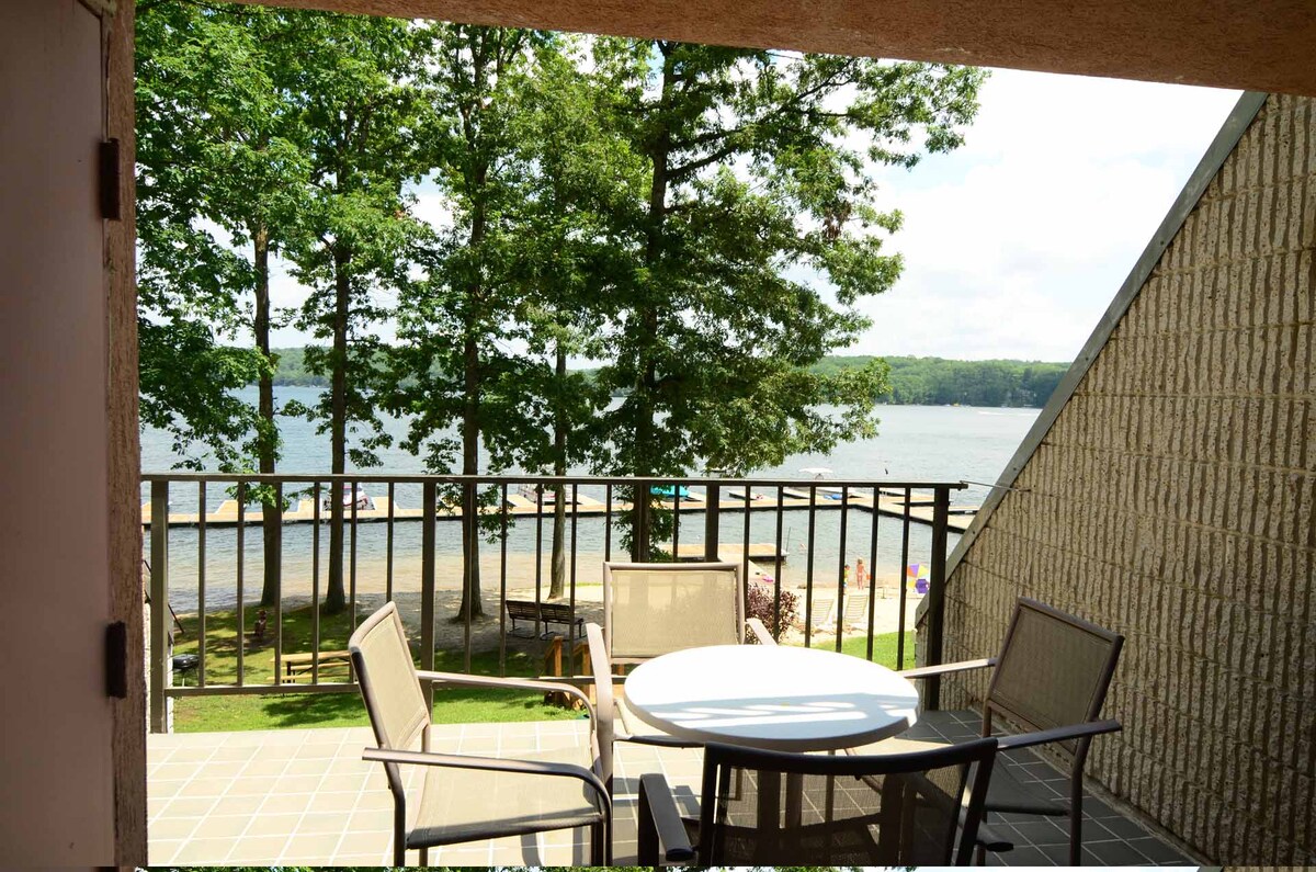 湖畔單間公寓閣樓,一間浴室公寓(末端單位),配有私人露臺、全功能廚房和電壁爐。(含電梯) 所有房客均可使用的飯店設施:室內泳池和分層漩渦熱水浴缸、兩個現場用餐地點、240英尺的沙灘海濱和碼頭、健身中心、遊戲室、壁球場、有棚停車場、免費WIFI和每個房間的湖景!