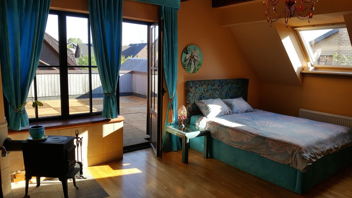 寬敞的單間公寓式客用住房,配有陽台和三溫暖,位於安靜的私人住宅區,可供2位成人(+ 1位兒童/青少年)入住。 樓上是單間公寓式開放式起居空間;樓下有廁所、淋浴間和桑拿房。有大窗戶和一個面向樹木和院子的陽臺。炊具、冰箱、壁爐、Wi-Fi、免費停車位;洗衣機。距離市中心和咖啡廳1200公尺。距離河畔步行小徑700公尺。拉脫維亞語和流利的英語溝通院子裡可能有一隻狗和一隻貓。