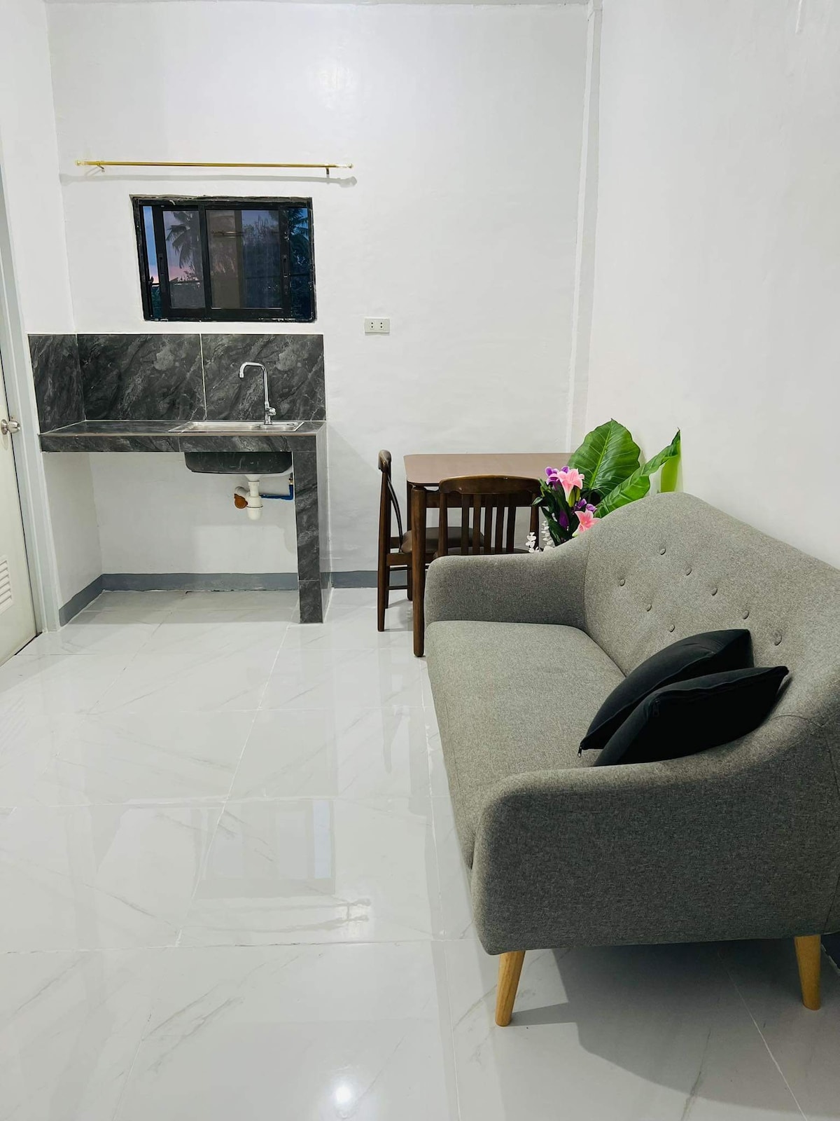 對面有廣場的舒適單間公寓,有穀倉式門窗。 包括雙人床、櫥櫃、置物架和衣架。 如果您想讓新鮮空氣進入,請使用空調或風扇保持涼爽。 小廚房配有冰箱、爐子、水壺、電鍋、鍋、平底鍋和餐具。 住宿期間提供免費礦泉飲用水。 套房浴室,有壁龕。 提供洗髮精和沐浴乳。 享受私人戶外用餐角落、洗衣區和側邊停車位。 附近有Sari-sari商店,可購買必需品。