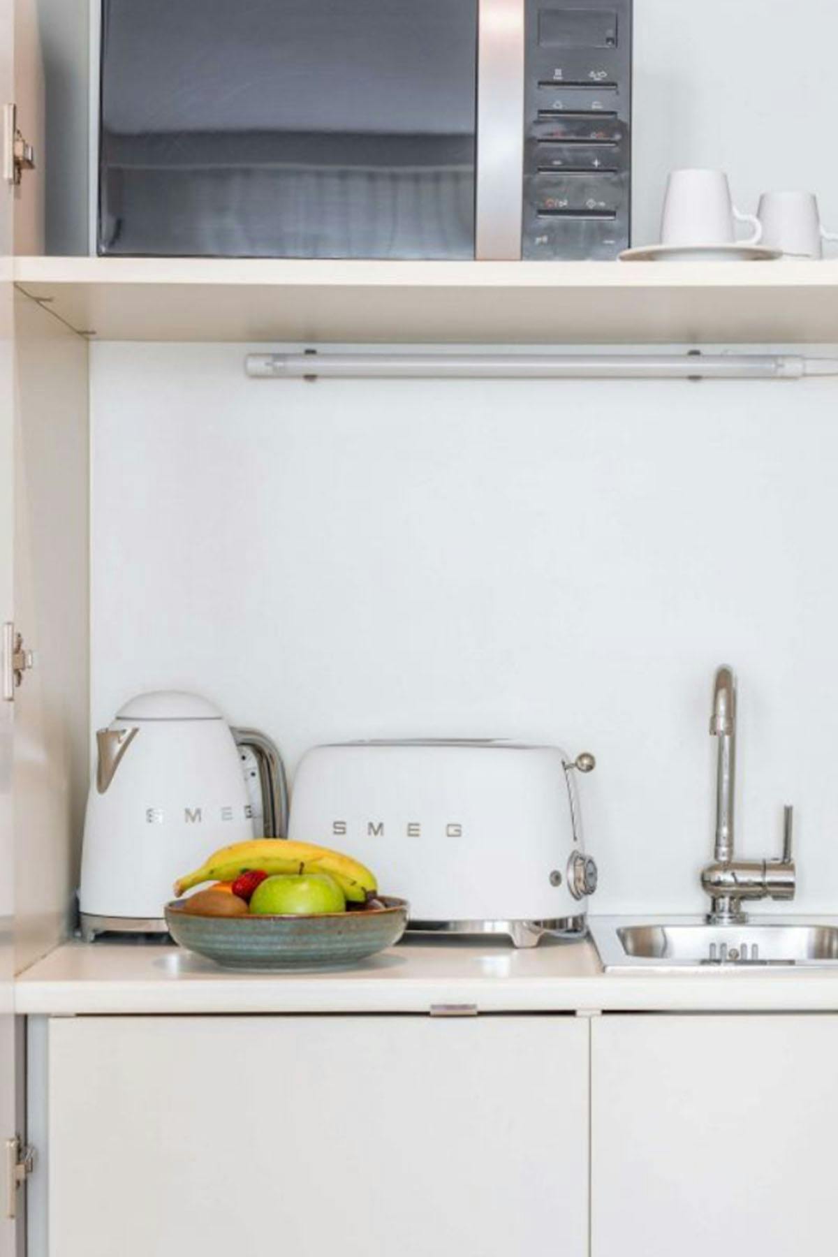 Twin Studio (21m²). Living area furnished with two single beds, office space, telephone, at screen LCD TV, and Internet access. Fully equipped kitchenette. Bathroom with shower and WC.