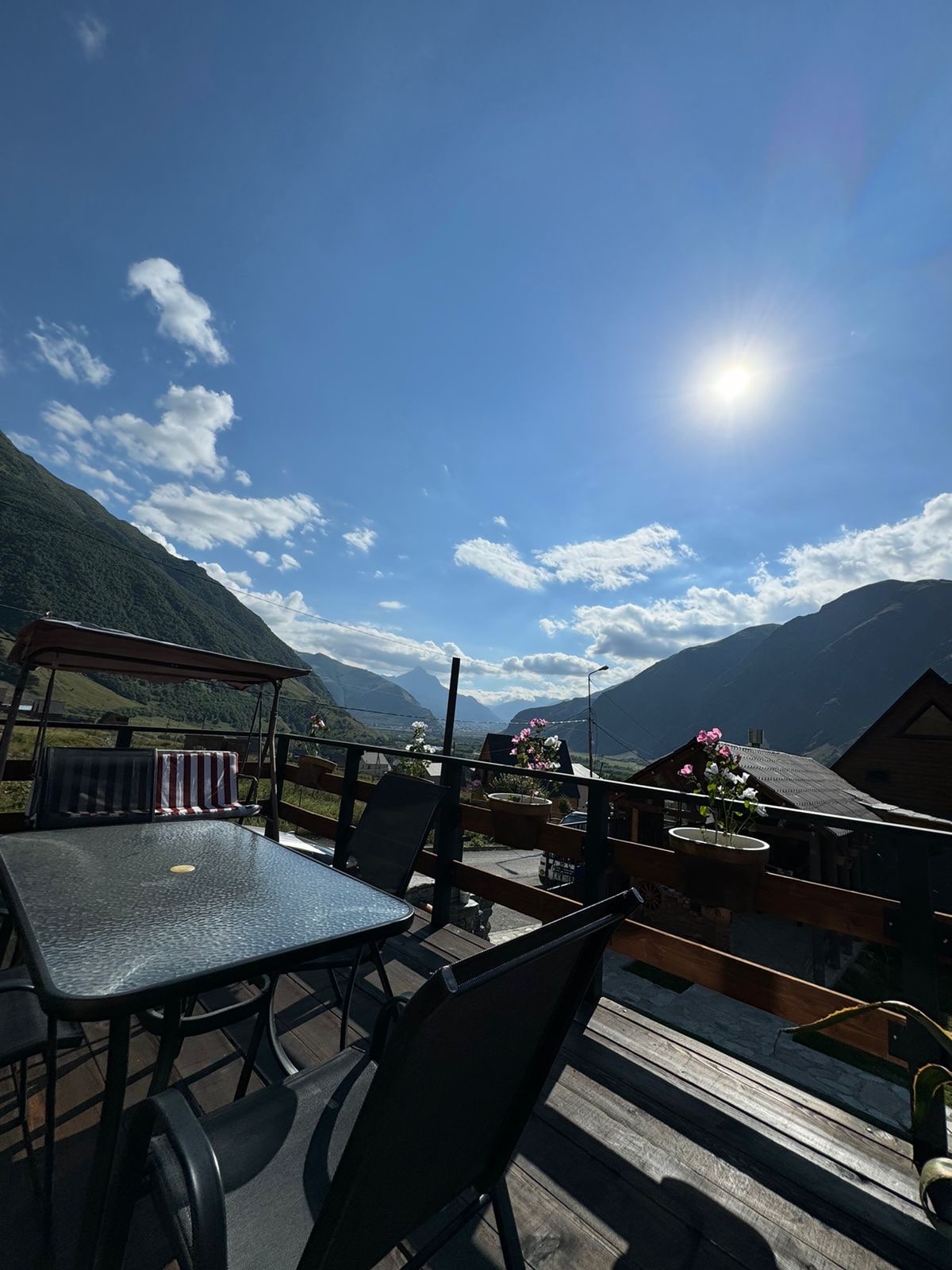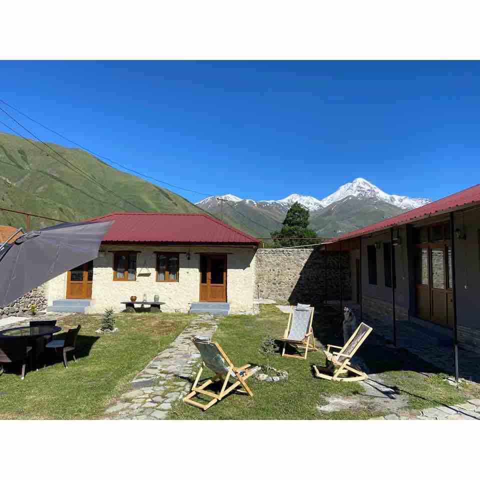 Panorama Complex -Your comfort zone. Our fully handmade wooden cottages & rooms are located in Kazbegi. This property provides luxury, cozy and comfortable private rooms and fully furnished cottages with splendid views of Mount Kazbegi and other nearby mountains. Each room features private bathroom with toilet and shower and a balcony. Free WI-FI. Separate sharing kitchen and living room with a fireplace and outside teracce with a view of a big yard.