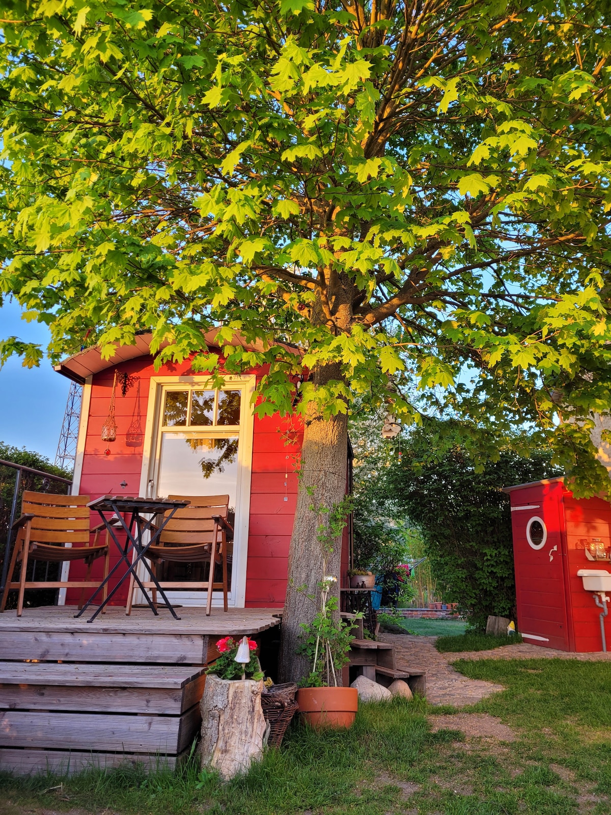 我們的迷你屋位於一個有著古老樹木的大型地產上,可欣賞周圍自然的美麗全景。 我們的迷你屋有一間帶全景窗戶的獨立浴缸浴室、一個可通過螺旋樓梯到達的睡眠區域、一個設備齊全的廚房和一個位於獨立建築物中的桑拿房。 在室外區域,我們提供帶涼棚的木製露臺、戶外淋浴間和 1700 平方公尺的花園。