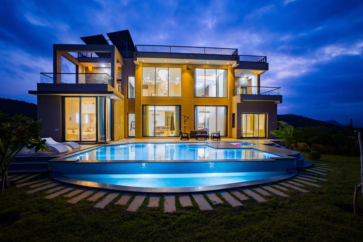 入住這個寧靜的住處,與全家人一起放鬆身心。 4Bhk豪華別墅,設有私人泳池,設備齊全的廚房,可欣賞Aravalli Hills的美景。房源是新的,位於Chirwa叢林山丘附近。 距離Forest phoolo ki ghati僅1分鐘車程,距離高空滑索僅1分鐘車程,距離Eklingji寺、Shahashtrabahu寺和Vaishnav devi寺僅5分鐘車程, Shrinathji寺距離我們的房源僅20分鐘車程,還有更多自然美景
