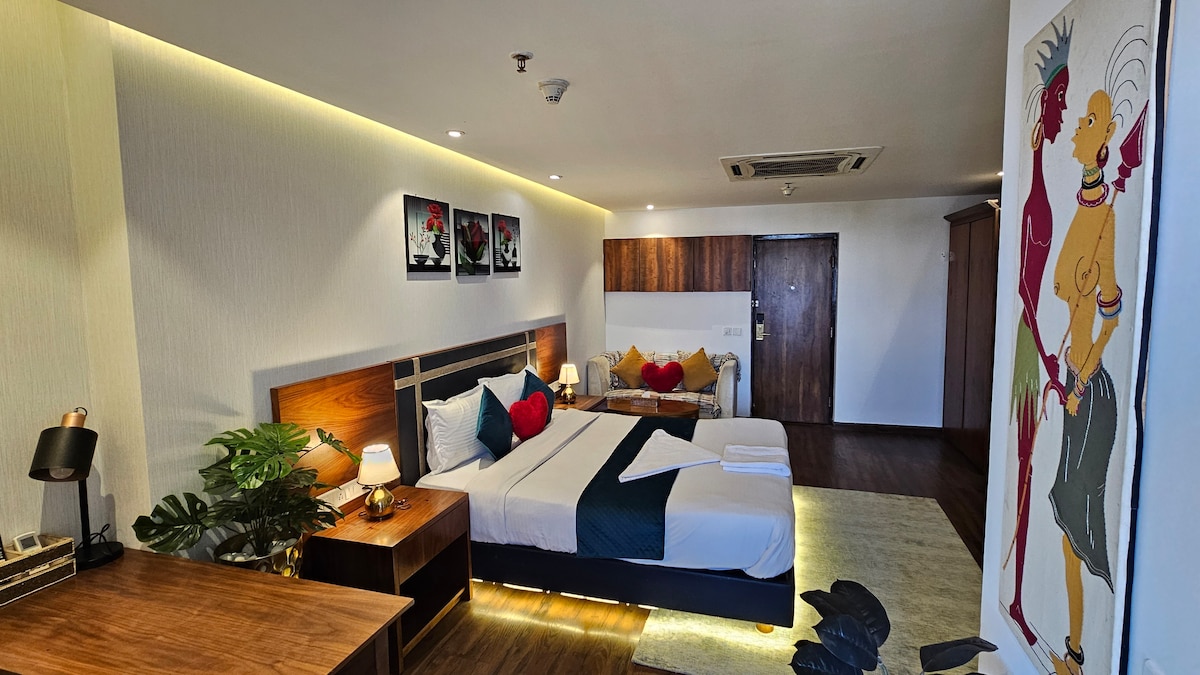 Lush by Lumen Leaf crowns Sector 63. Floor‑to‑ceiling glass reveals Gurgaon’s skyline and sunrise over the Aravalli hills. Sink into a king bed with plush throws, mood lighting, Wi‑Fi and Netflix, or brew pour‑over coffee at the desk. A sleek kitchenette, stocked minibar and spa rain‑shower spoil you. Cafés, boutiques and an INOX cinema lie 5 min away; CyberHub, Golf Course Road and HUDA City Metro are just 12 min—perfect for work stays, staycays or couple escapes.