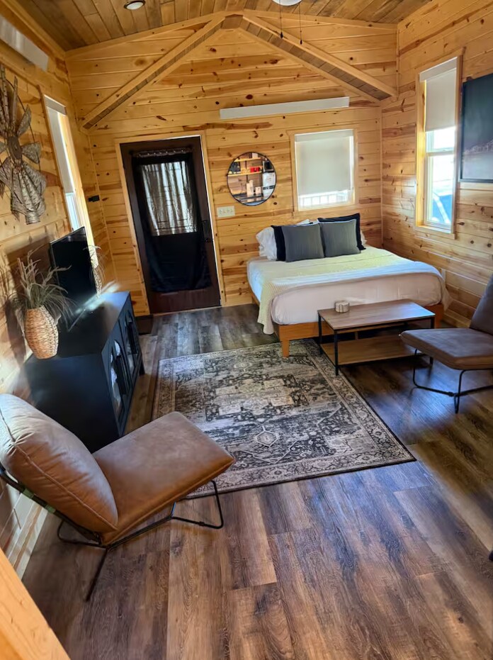 The "Cabins", though very small, are fully accessorized with complete kitchen , bathroom with shower and modern construction. Full size bed. Western decor with Wifi (fiber optic) Smart TV with your subsciptions. Parking on Main Street immediately in front. Take a break and unwind at this peaceful hometown oasis.