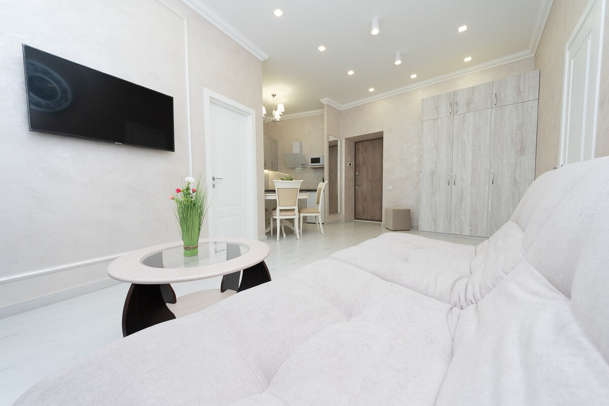 This modern apartment is made with quality materials and thought throughout every detail. Located in a quiet area, yet steps away from Pechersk attractions, cafes and bars, a big supermarket, and close to two large parks with a scenic river view and great for morning jogging.