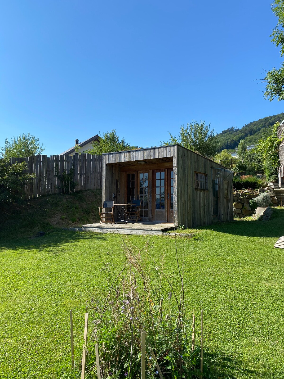 Genieße im autarken Tiny Haus die Natur und den sensationellen Ausblick Richtung Traunstein, Grünberg und in die Ferne. Versuche dich in einem nachhaltigerem Lebensstil, indem du die Ressourcen bewusst nutzt. Unsere Hühner und 4 Zwergesel sind im Hang unterhalb/neben dem Tiny Hause angesiedelt. Im Tiny Haus erwartet dich eine Küchenzeile, ein Bad mit Dusche, ein Loft mit Doppelbett sowie eine ausziehbare Couch im Wohnraum. Vor dem Haus kannst du gemütlich ausspannen und die Sonne genießen.