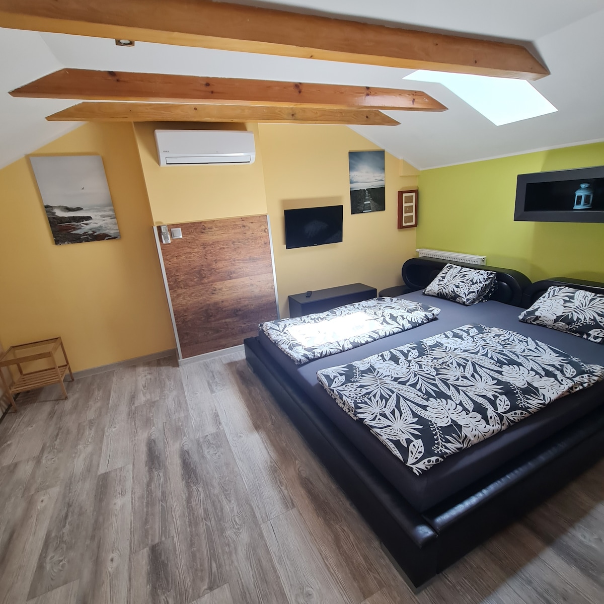 一樓有陽臺的雙臥室公寓56平方公尺。獨立入口。 一間配有電視的臥室,兩張可組裝的單人牀。 大房間配有電視、雙人牀客廳:轉角牀+腳輪牀(梳妝臺) +兩張單人牀可組成。 兩間客房均配有空調。設備齊全的廚房,配有洗碗機。 浴室有洗衣機、熨鬥。 公寓內WIFI。免費停車