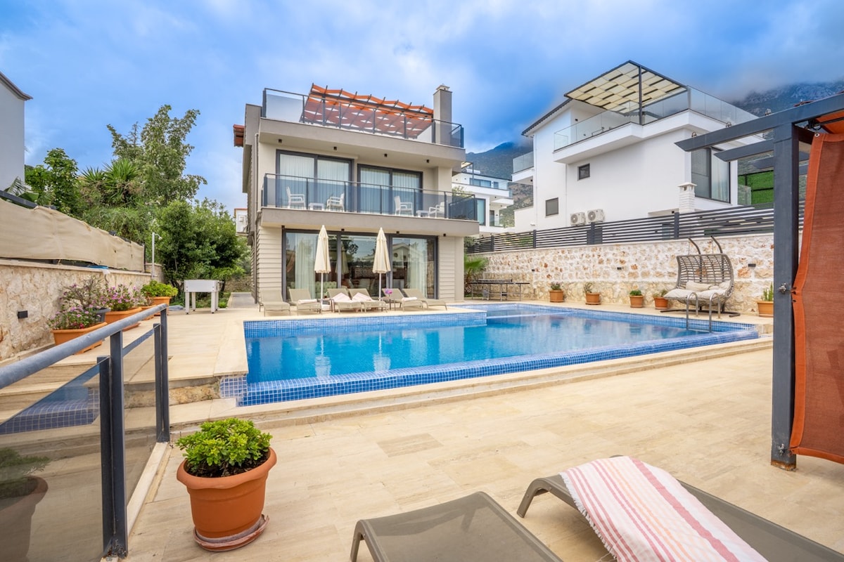豪華別墅,可欣賞壯麗的海景、泳池、大花園和按摩浴缸! 在費特希耶最美麗的地方享受難忘的假期體驗等著您。 它是為了讓蜜月情侶和家庭入住而設計。步行即可抵達海灘、餐廳、咖啡廳和超市。三樓是露臺,有按摩浴缸、日光浴躺椅和用餐區域。入口外面有樓梯。 每層樓都有廚房休息室和臥室,所有房間都有空調。