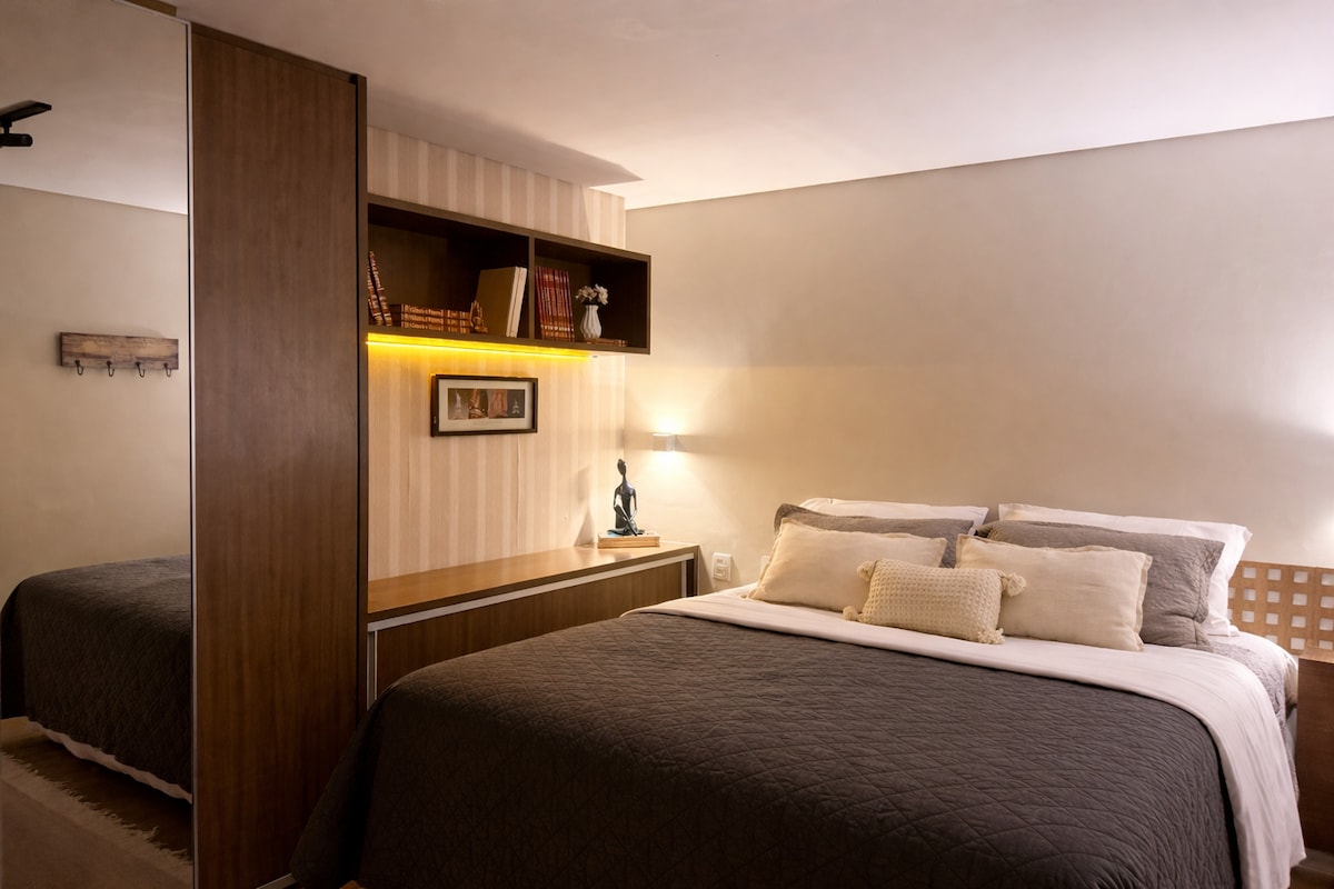 Enjoy a charming, fully equipped, and beautifully decorated apartment in the hart of Setor Bueno. It features two cozy bedrooms - one with a super king-size bed and another with a double bed. Just 350 m from Vaca Brava Park and Goiânia Shopping, on the same street as Buena Vista Shopping, across from a bakery and market, and 3 minutes from Bluefit Gym. Surrounded by pharmacies, cafés, bars, restaurants, hospitals, and all the best of Goiânia . 🌿✨