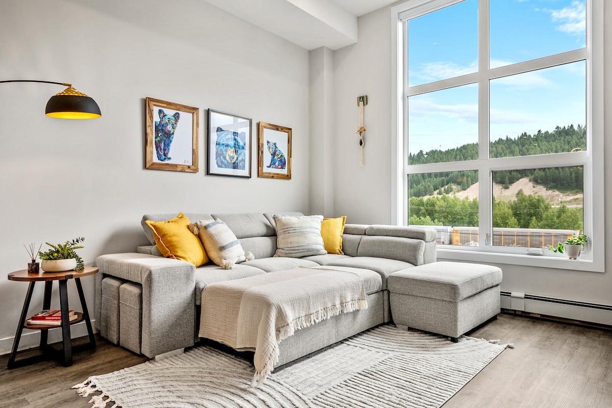 歡迎來到這間現代化、寬敞的套房,從每扇窗戶都可以欣賞到金山壯麗的山脈和傳奇的Kicking Horse Mountain Resort的美景。 露台俯瞰一個安靜的公園,步行一小段路即可抵達市中心,穿過獨特的木框架人行橋,還有風景優美的自行車道和步行道。 在咖啡吧煮一杯飲料,在滑雪或冒險一天後,在大型石頭瓦斯壁爐旁蜷縮放鬆。 快來入住我們的房源,體驗 Golden。