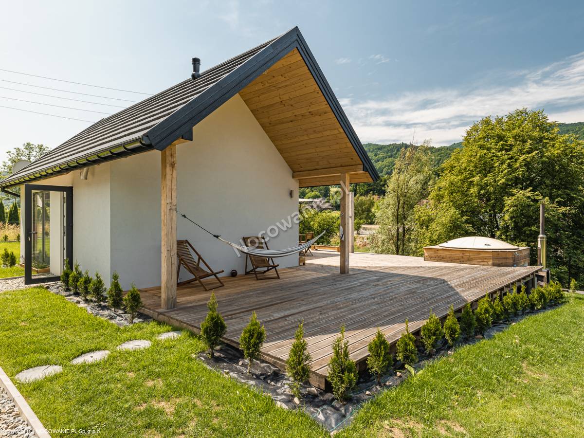 小屋位於山林間,設備齊全, 小屋面積為35平方公尺,配備正常運作所需的一切設備。 廁所、淋浴間、廚房與客廳和臥室相連,從客廳可以出入陽臺,從陽臺可以看到整個空地和Bielskie Tatras。 大樓的屋頂上有一個大露臺,您可以在天氣好的日子裡做瑜伽或放鬆。 可支付額外費用使用桑拿和熱水浴缸 峇里島150 PLN - 2.5小時 桑拿 150 波蘭茲羅提 - 2.5 小時