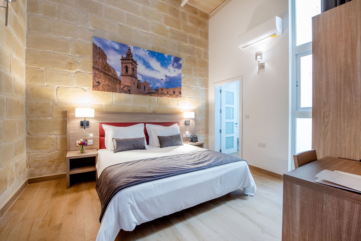 A warm and charming room, characterized by an antique bed and the original, traditional Maltese tiles. This room is on the ground floor and included you will get access to the pool area, as well as a free breakfast where you can choose from various items such as English/ Continental Breakfast, Granola Parfait, Fresh Fruits, and Homemade cakes. We also recommend trying our special brewed coffee!