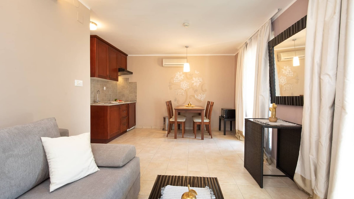 Apartments Nadia位於家庭住宅的一樓。 設備齊全的公寓,為您提供舒適的住宿體驗。 您可以享受配有日光浴躺椅的私人大露臺,以及配有椅子的桌子,可供您欣賞海景美食。 房子周圍有一個橄欖樹林,您的孩子可以在那裡玩耍,還有一個燒烤供共用。 海灘距離房源約600公尺(空中距離) ,有停車位、自然環境和設施。 我熱切熱切熱切地歡迎您入住我的公寓!