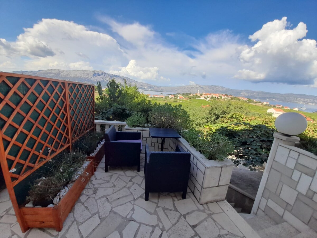 Novi apartman sa predivnim pogledom na more i Stari grad Korčulu.Površina apartmana je 85m2 i udaljen je svega 400m od starog grada Korčule.Smješten je na kraju mirne ulice okružen šumom.Potrebno Vam je samo par minuta šetnje do starog grada,restorana,luke,mora i trgovine.