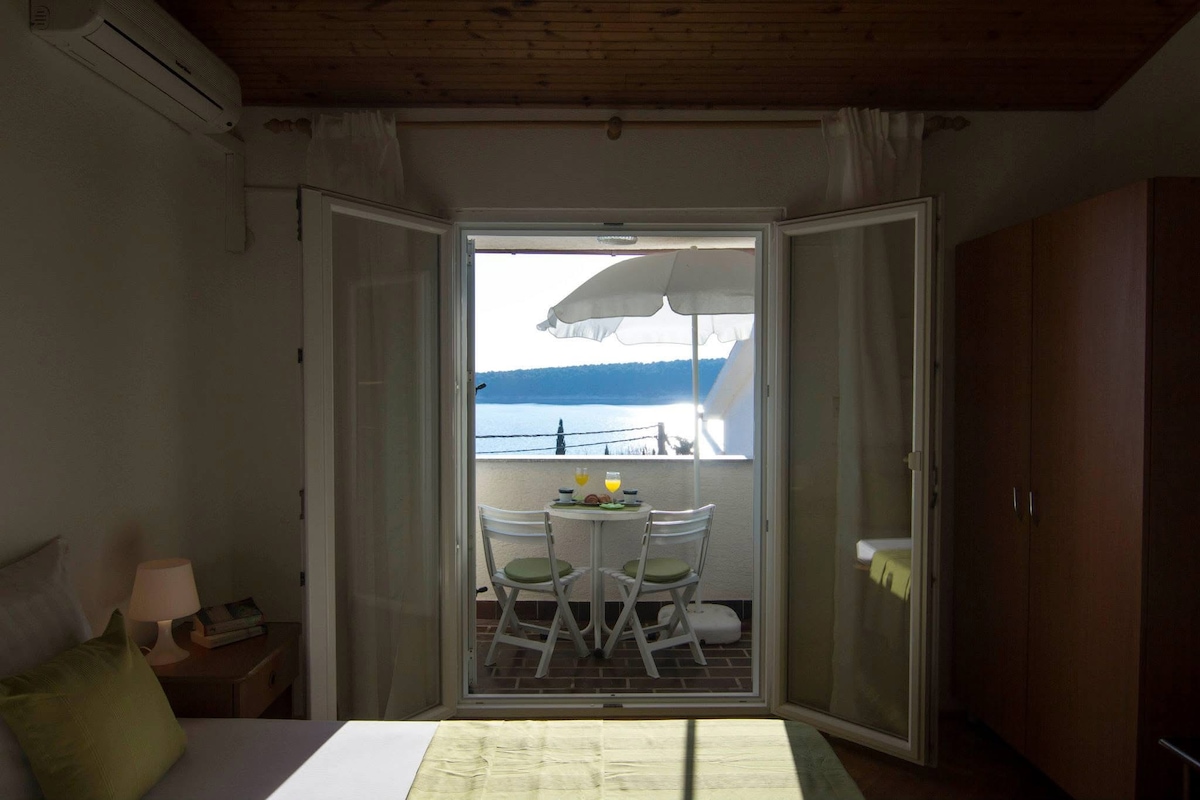 配有廚房、海景陽臺、雙人床、浴室、廁所、WiFi和空調的單間公寓。 距離海邊和海灘僅50公尺。 位於我們的家庭住宅,有4間公寓,靠近海灘、巴爾巴特、拉布。 附近有幾家很好的餐廳、披薩店和酒吧,以及2家超市。 美麗的海濱步道8公里,非常適合步行或騎自行車。 適合兒童和家庭參加。 由我可愛的媽媽和奶奶接待。 像當地人一樣探索島嶼。 房子前面有付費停車位