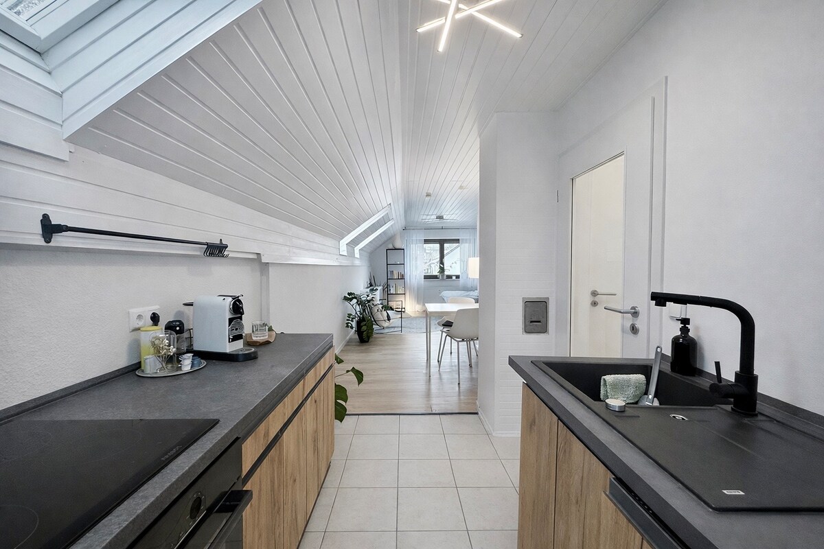 住在Gründerzeit房子:獨特、舒適、更美麗! 現代閣樓公寓位於霍夫市中心美麗的Gründerzeit房屋。步行區和火車站步行幾分鐘即可抵達。 閣樓有小廚房、一張雙人床、一間套房浴室,配有獨立浴缸和地板淋浴間。天花板聚光燈可以調整顏色,為沐浴創造獨特的舒適氛圍。