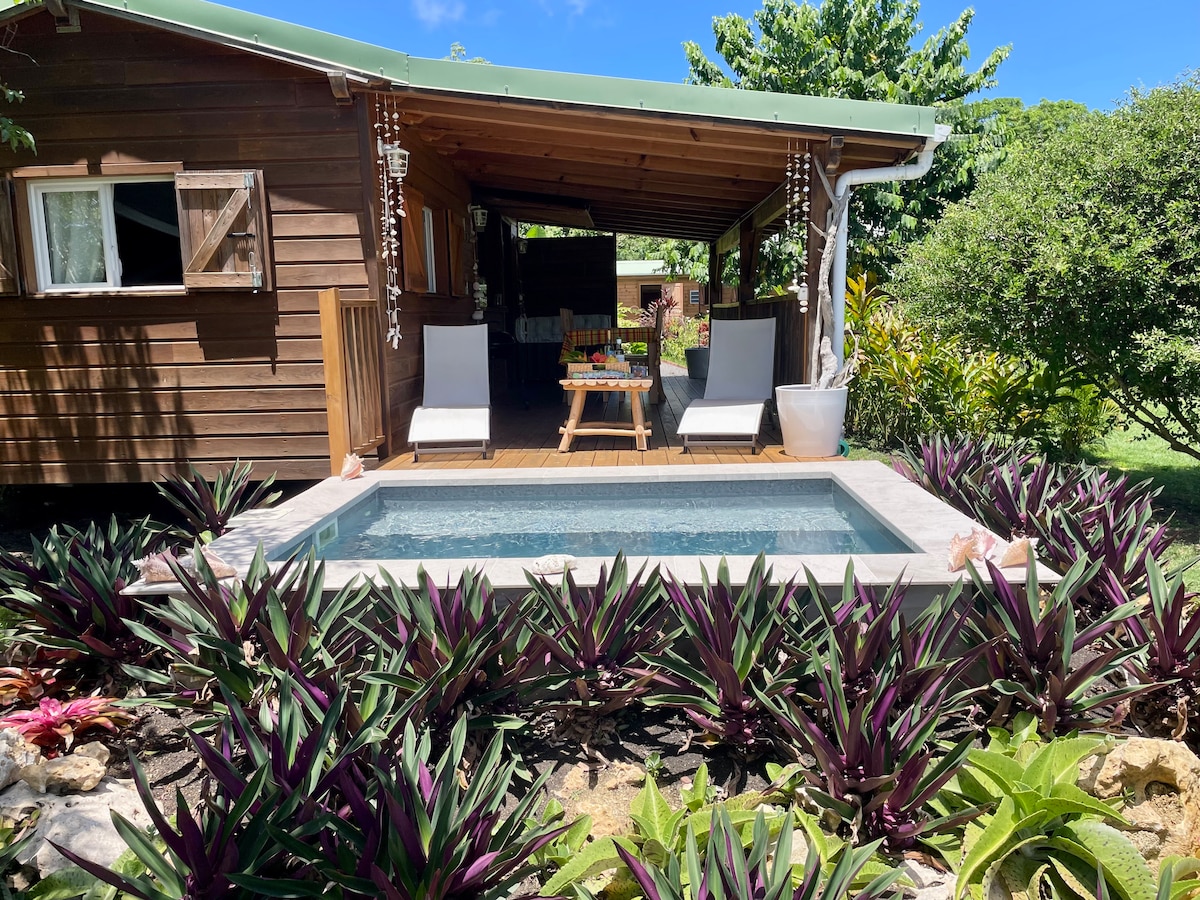 在這間安靜時尚的平房中放鬆身心。 家具齊全,空調,配備露臺和花園,可容納2/3人, 坐落在Grand Bourg鎮,坐落在鬱鬱蔥蔥的植被中心,您可以直接前往Folle Anse海灘, 雙人臥室、配有沙發牀的客廳、淋浴間/獨立廁所、露臺上的設備廚房、私人花園上的餐廳、停車場、 可使用KAWANN村的游泳池。