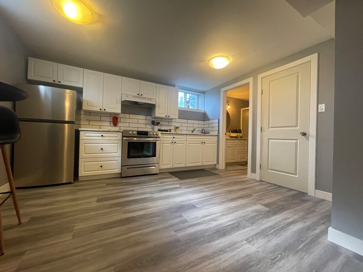 Kick back and relax in this calm, stylish space located in close to all amenities. This open concept floor plan is flooded with natural light and includes, private parking for 2 vehicles, 2 bedrooms, 2 full bathrooms, dining area for 4 and a fully stocked kitchen complete with air fryer and Nespresso machine. We hope to provide you with a comfortable home away from home. Enjoy the ease of keyless entry and a quick check in. We hope to host you soon !!
