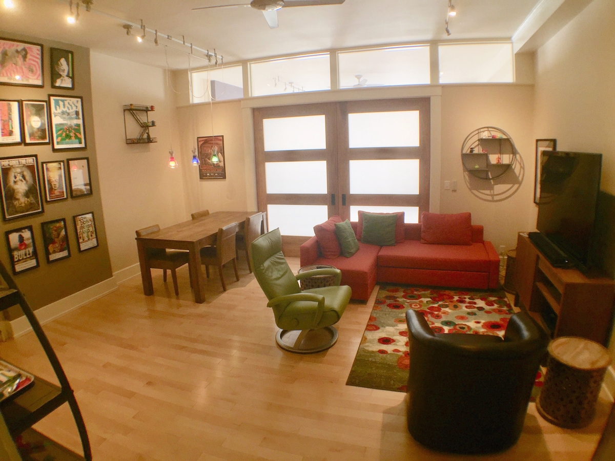 Just Remodeled! King Bedrm, Living Rm, Full Kitchen & Bath, Laundry, & ON SITE SECURE PARKING INCLUDED (best for smaller cars) Huge 5' x 5' shower! WiFi, large dining table/desk, 65" 4K TV. Most vibrant neighborhood in town! Sorry, it's not pet or kid friendly. It's a boisterous, fun, urban neighborhood, with a live music venues across the street! Fridays & Saturdays are particularly lively, it's not best place for resting & relaxing - better for those wanting to get out there!