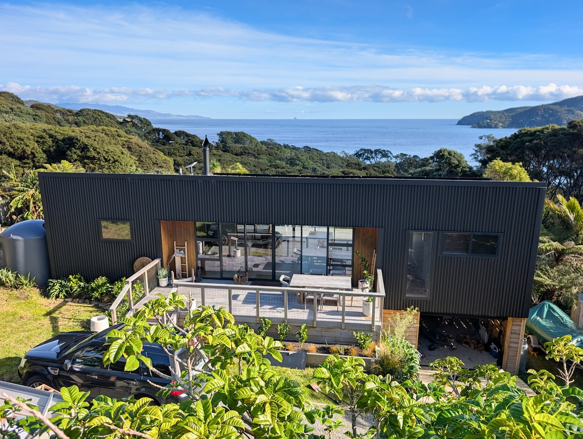 在大堡礁島的Tryphena的Schooner Bay,讓自己和親人享受懸崖頂的寧靜 * 海浪在 100 公尺下方拍打,觀賞海豚/虎鯨/鯨魚/蝠鱝 *美麗的生態建築,建築設計,冬季舒適 *非常適合蜜月旅行者、觀星者和寧靜愛好者 * 4WD位置保證獨處;業主在現場協助提供電力、熱水和島嶼小費。 請聯絡我們,以獲得折扣航班價格。 歡迎大家! 🏳️🌈