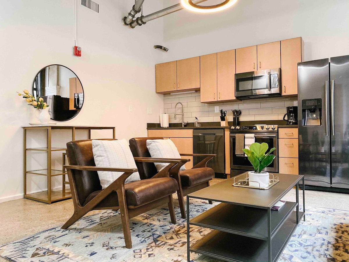 這間豪華的都市頂樓公寓,將歷史魅力與現代優雅完美融合。在開放式的起居空間放鬆身心,欣賞外露的磚牆和大窗戶。在專業廚房中烹飪美食,然後在戶外餐桌上享用戶外用餐。在露台上放鬆身心,欣賞諾克斯維爾市中心和山丘的全景。在戶外火坑旁聚會,在星空下的私人屋頂露台上喝一杯。