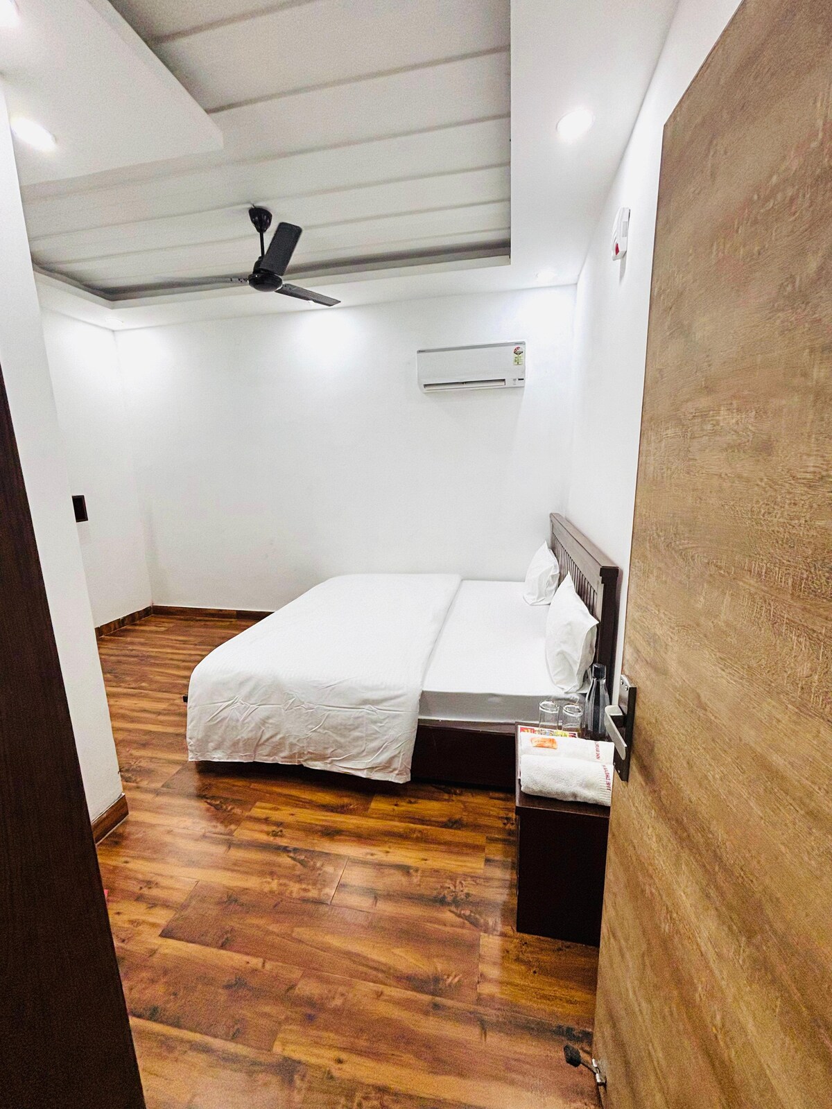 Modern Hotel Room with Premium Comfort Relax in our stylish hotel room featuring a comfortable queen-size bed, private bathroom, flat-screen TV, and complimentary Wi-Fi. Guests enjoy - Nice City View from the window. Housekeeping ( ON - Call ) Access to hotel amenities including the In-house restaurant. RO water Induction for light cooking. Kattle Fresh Towels Fresh Hand towels. Mini Fridge. Kitchen utensils.