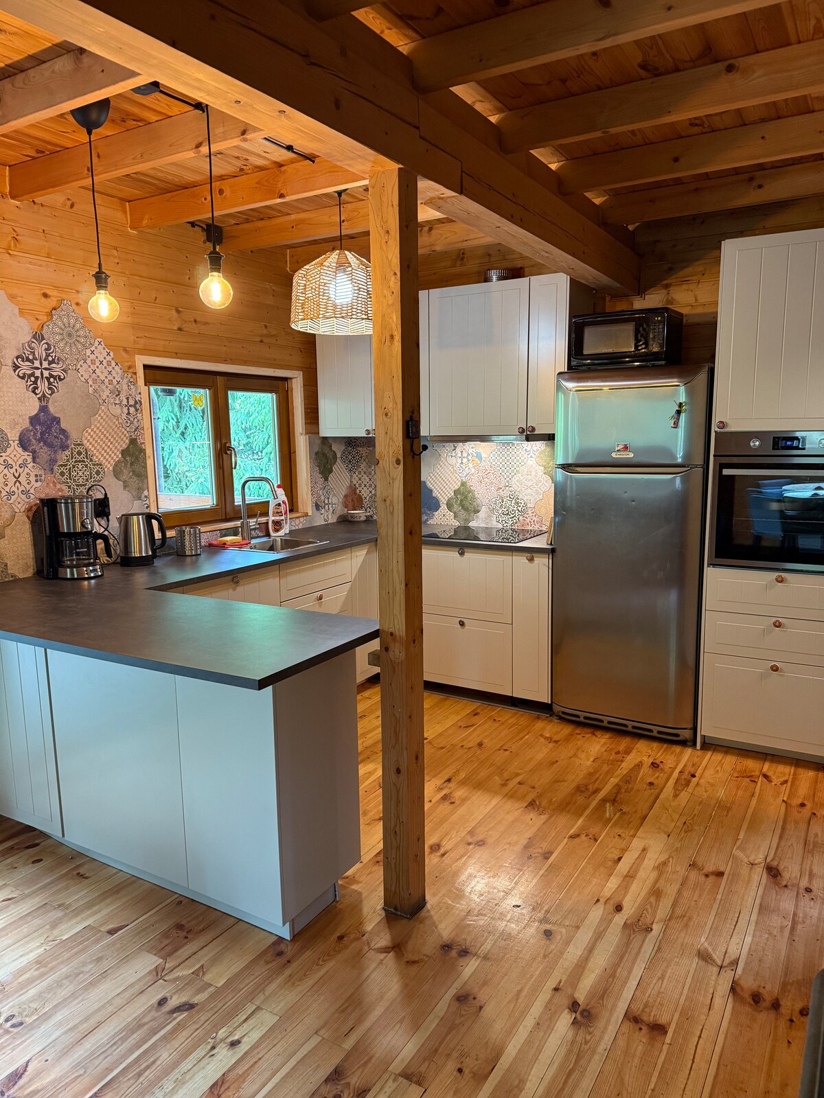 森林邊緣的現代寬敞室內裝潢,四周環繞著大自然。 如果您想在寧靜、放鬆的氛圍中度過時光(在投影機上觀看電影或在大自然景觀下放鬆地泡澡),這裡絕對是理想地點。 三間雙人臥室;寬敞的客廳,配有折疊式角落;設備齊全的廚房;兩間浴室、露臺和夏季使用的戶外熱水浴缸。 禁止大聲舉辦派對。 我們不接受男性團體。