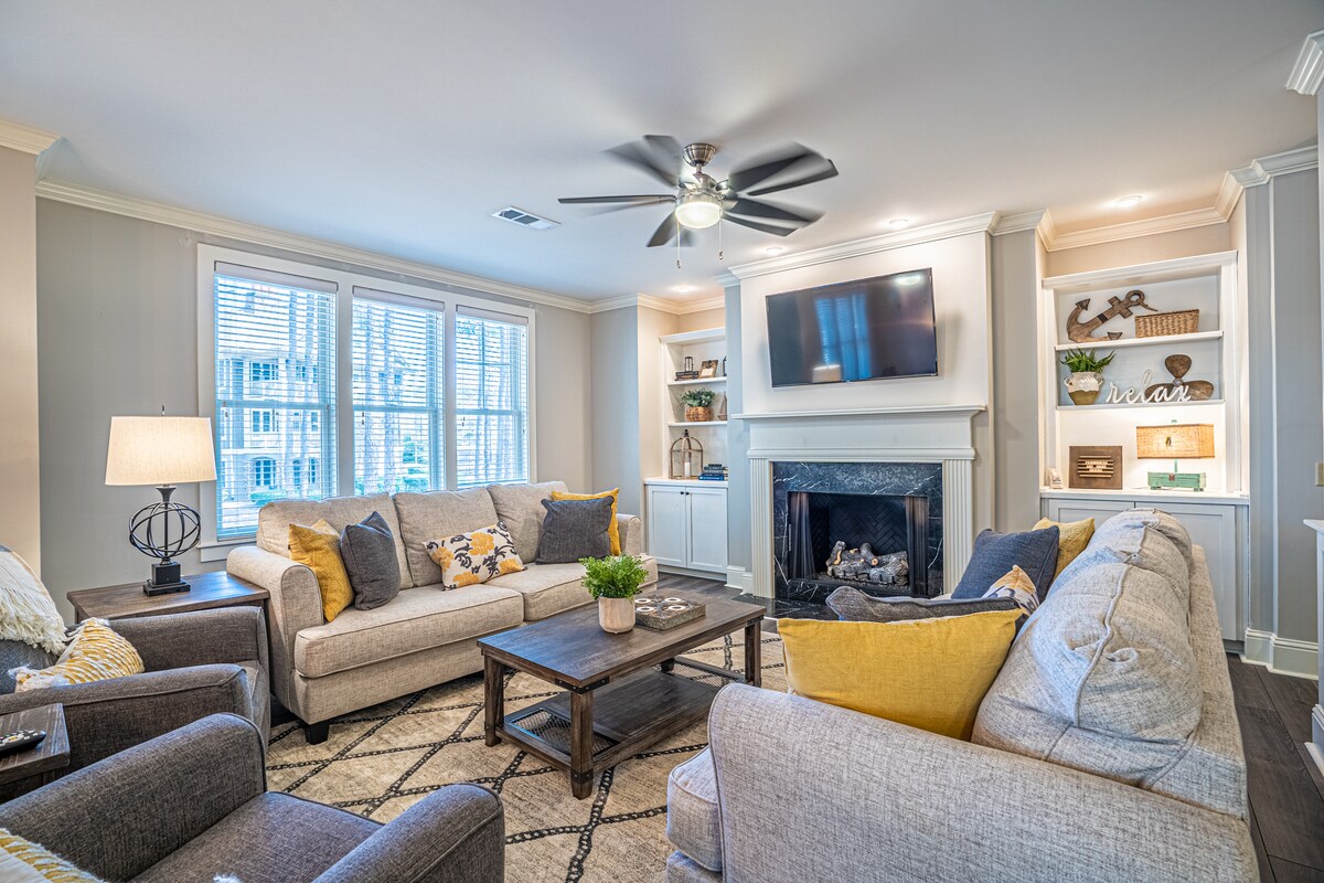 Have coffee while taking in the waterfront view, enjoy family time at the lake, or just relax with friends and family! You will feel right at home in this cozy four bedroom, 3.5 bath townhome that sits on the water and has a boat dock for your boat or jet skis. There is plenty of space to sleep a large group and enjoy your time together, with 2 family rooms, a large kitchen, a TV/game room, and plenty of beds. You also have Wifi and quiet space to work. Convenient to many restaurants and shops.