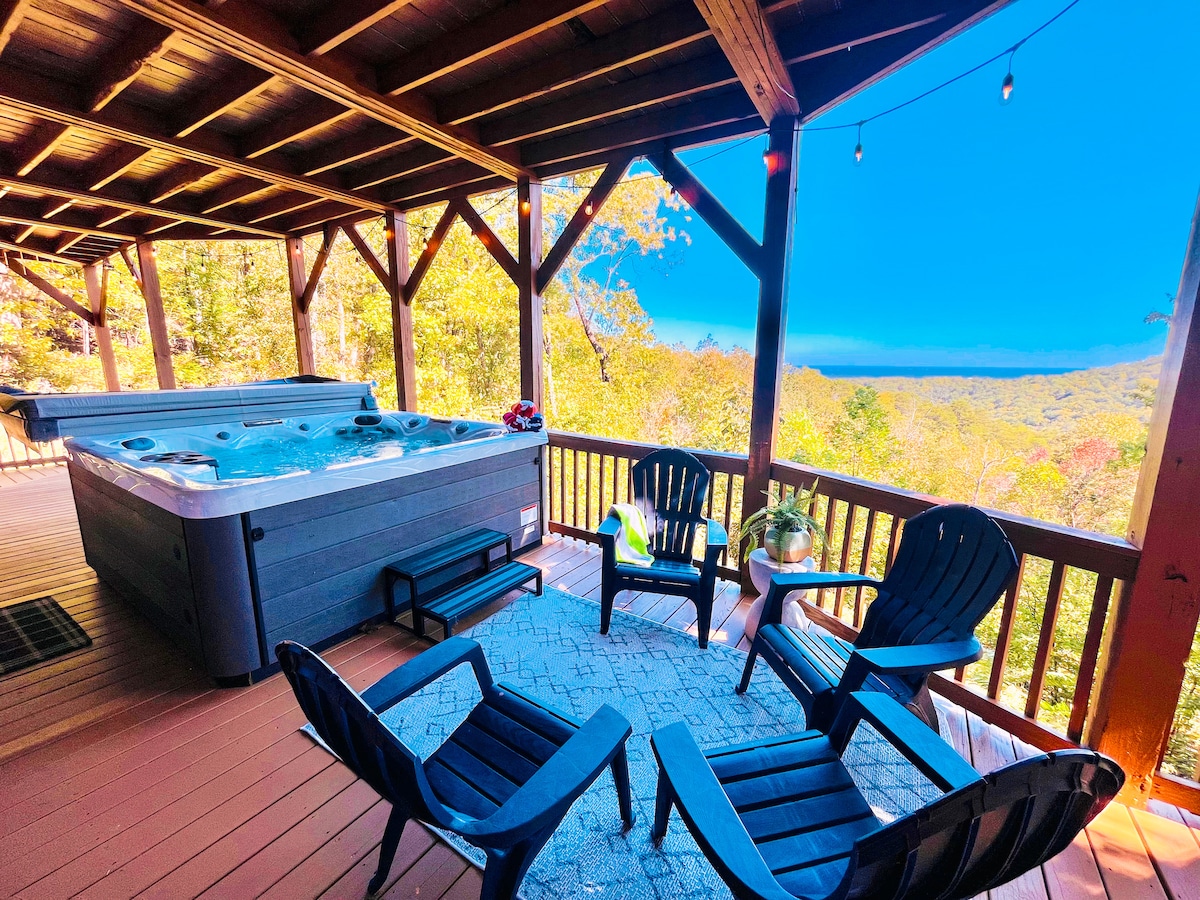Cozy one bedroom log cabin with large private back deck and hot tub. While being surrounded by nature can be an enjoyable and a relaxing break from hectic day to day lifestyles, please realize that this cabin is in the woods and we do have carpenter bees and camel crickets along with some ants. We strive to keep the pests at bay but they are part of mountain life. Shared spaces include the fire pit along with the overlook bench.