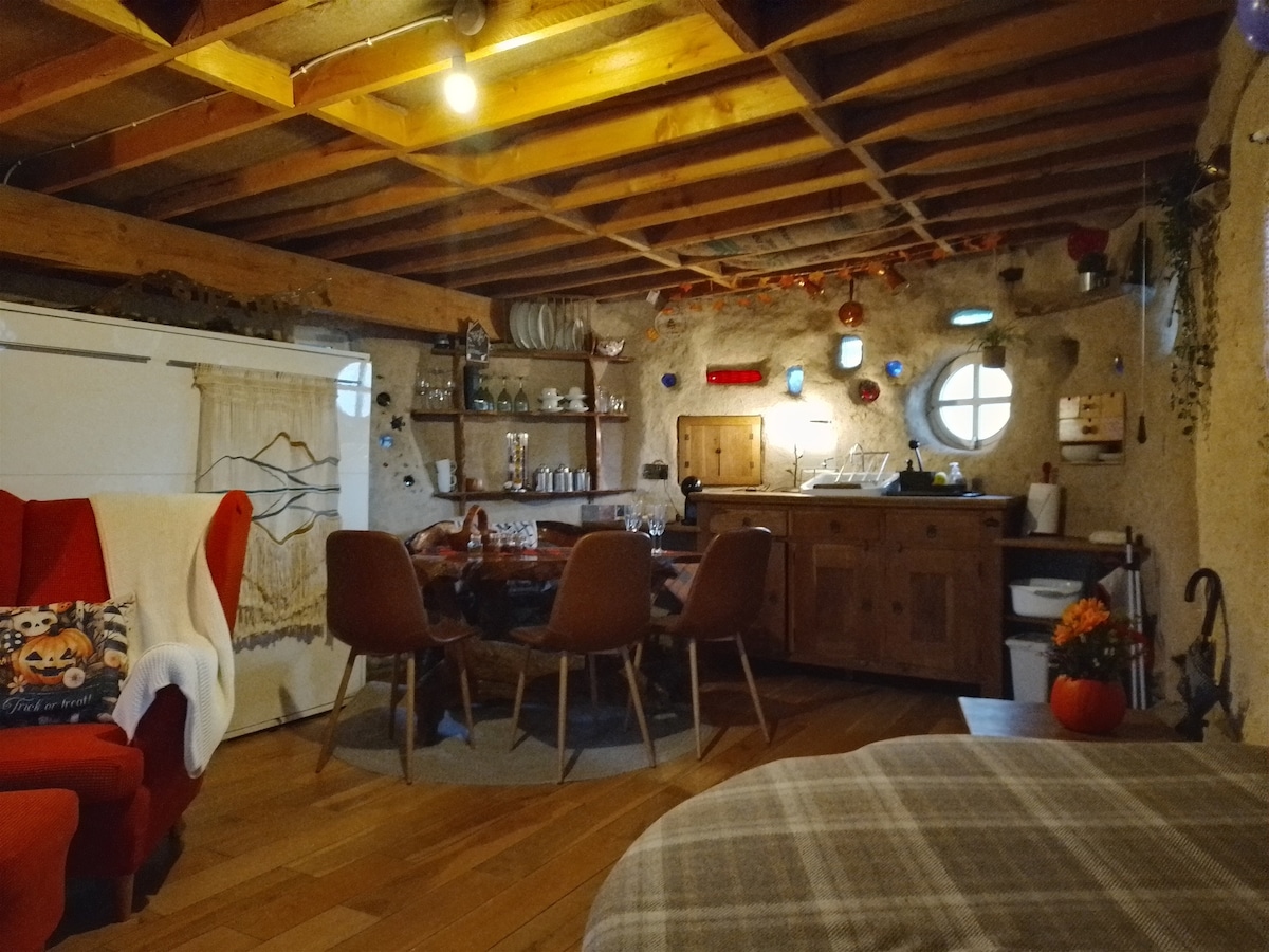 您會喜歡這個浪漫的度假勝地。坐落在我們花園的盡頭,這位美麗的房東建造的cob小屋溫馨而獨特。小屋有自己的奇妙花園和環繞的甲板,您可以在熱水浴缸(2月至11月)放鬆身心,俯瞰農村,或在露臺廚房烹飪。 小屋內的開放式起居空間迷人,配有圓形窗戶、玻璃瓶牆、沙發和定制橡木廚房,以及舒適的雙人墨菲牀。中央暖氣。
