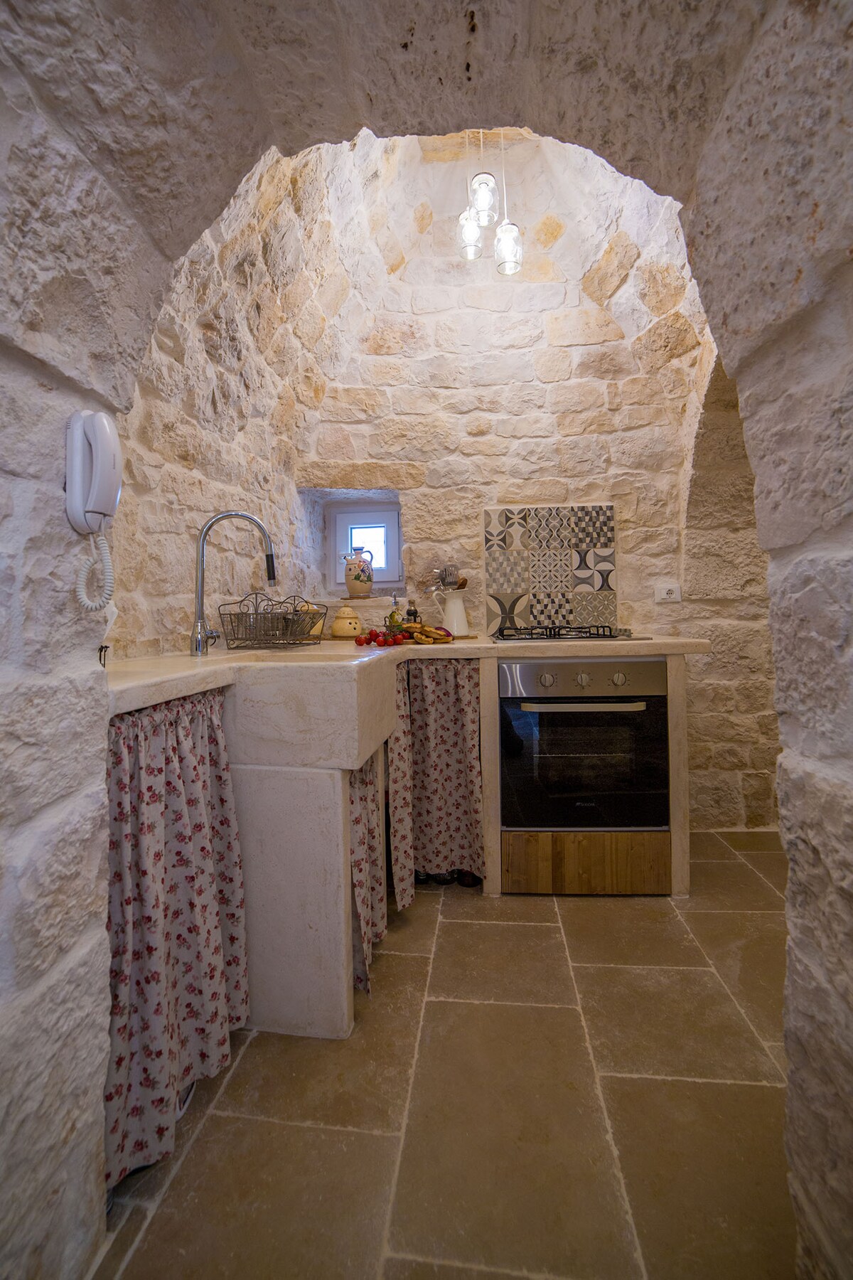 這個獨特的空間,在傳統的圓頂石屋內雕刻,有自己的魅力,讓您體驗伊特里亞谷的真正精神。 您穿過一個舊的草莓葡萄藤架進入。 廚房和衛浴位於壁龕中,而用餐和睡眠區域位於撒拉遜圓頂屋和高圓錐圓頂屋中。 私人露臺和附近的無邊泳池可欣賞山谷和Ceglie Messapica天際線的景觀。