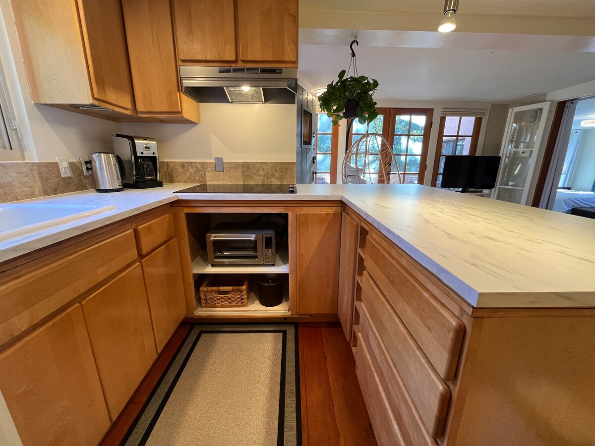 這間寬敞的單間公寓距離希臘劇院、加州大學伯克利分校、伯克利市中心和BART)、Chez Panisse和屢獲殊榮的餐廳、LBL等僅幾分鐘路程,全天自然光線充足。面對我們鄰居的院子,您甚至可以看到野生動物經過。 配有加大雙人床、壁爐暖氣、漂亮的浴室、衣櫃、坐式/站式辦公桌、Keurig、電視和自己的入口,無論您是因商或度假,都可以舒適入住!