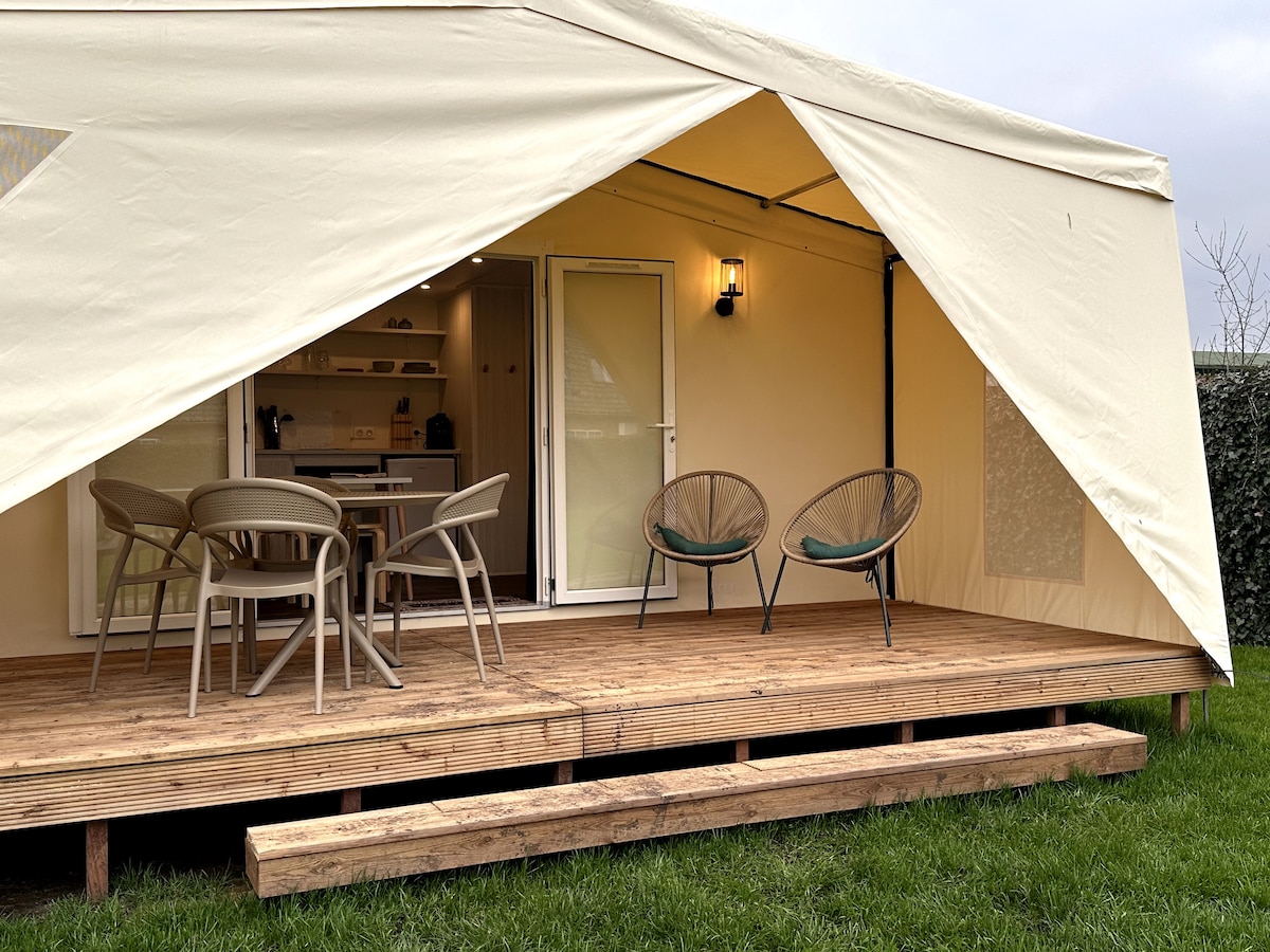 安靜的迷你露營地Petit013的豪華野生動物帳篷。 我們致力於待客之道、奢華舒適。 帳篷有自己的豪華浴室,配有淋浴間、水槽和馬桶。 廚房設備齊全,有碗盤、廚具和廚房毛巾。 每人有牀單,浴巾已準備好(包含在房價中)。 來享受寧靜祥和的住宿體驗。清晨在露臺上曬太陽。傍晚時分,在帳篷後面的座位上傍晚的陽光下喝一杯。