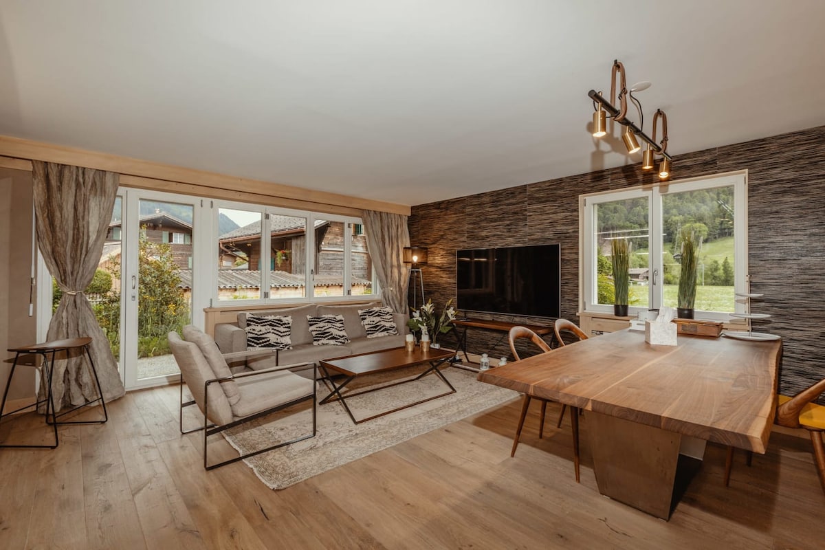 全新舒適的鄉村風格單間公寓。非常適合兩人入住,欣瑞士山景的最美一面。位置非常安靜,是放鬆身心的理想之地。距離格施塔德 (Gstaad) 10 分鐘車程。上午7點至晚上7點之間有公共交通工具。 非常適合在冬季滑雪、冬季徒步旅行和越野滑雪。夏季有各種徒步旅行的選擇。