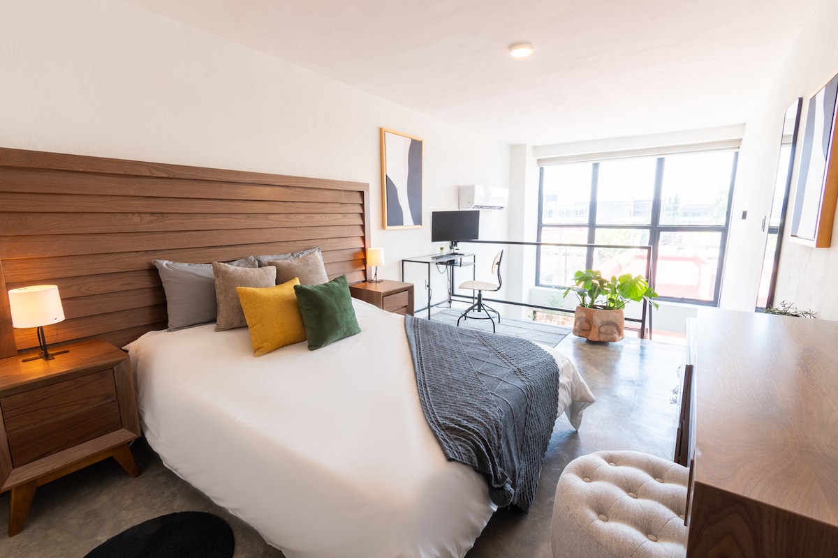 您好!歡迎!體驗瓜達拉哈拉市中心的Tapatía! 探索這座城市最受歡迎的地區之一:La Colonia Americana-Expiatorio。 為您設計的極佳Loft :您可以使用法式壓縮機享用豐富的晨間咖啡。在廚房裡,當您想在家用餐時,您可以找到所需的東西。在私人露臺上品嚐冷啤酒或豐盛的葡萄酒,在線高速航行,然後在大型標準雙人牀上休息。