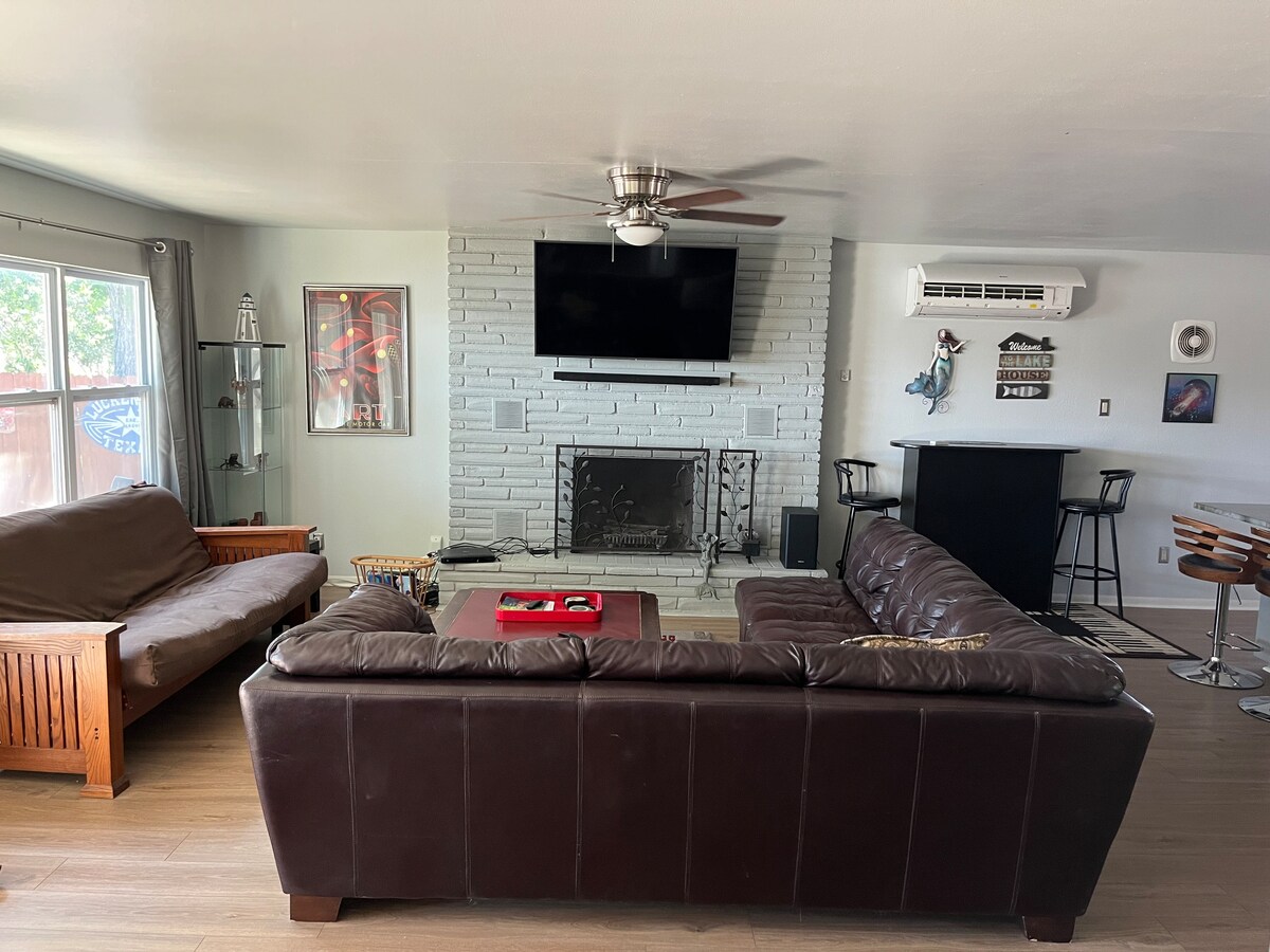 靠近峽谷湖景點的現代化、有趣、適合家庭入住的房源。 專為情侶、家庭和小型團體設計,尋求舒適的住宿和獨特的娛樂。 房客為什麼喜歡這個房源 •配有LED照明的私人按摩浴缸 •室外電視休息室,可供休憩 • 霓虹燈照片牆 — 令人驚嘆的體驗 • 可以玩幾個小時的街機遊戲 • 電動車充電器(2 級) • 披薩烤箱+室外用餐 •配備座椅的火坑 • 所有房間配備 Roku 智慧電視 •寵物友善住 •高速WiFi