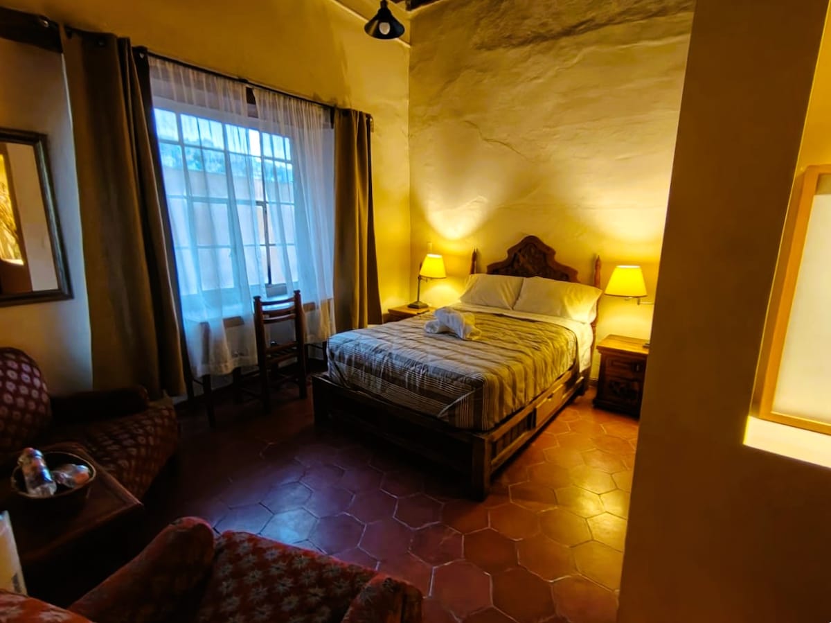 🏡 Hospédate en una casona colonial del Siglo XVIII en el corazón del Centro Histórico de Guanajuato. 🎭 Esta suite fue testigo del nacimiento del Festival Cervantino, donde los artistas se preparaban para los Entremeses Cervantinos. ✨ Combina comodidad moderna, Wi-Fi y baño privado, con la magia histórica y cultural de la ciudad a tus pies, sobre la calle Positos.