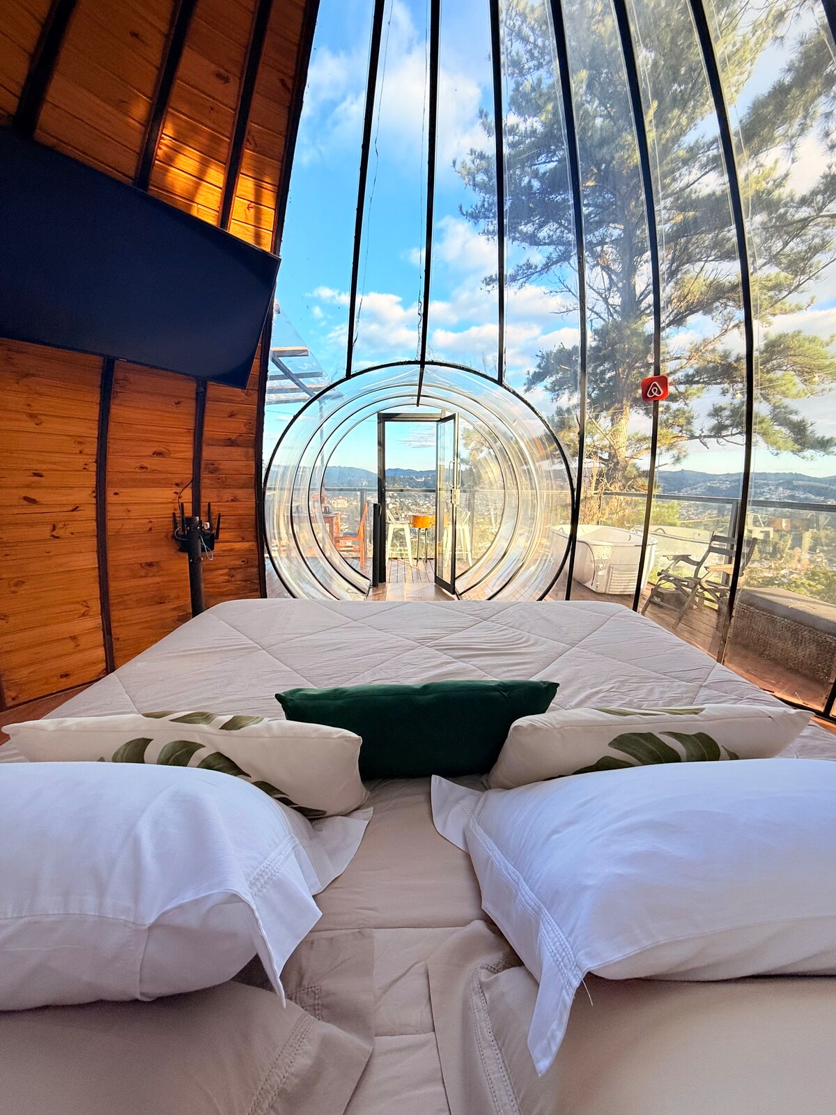 O Iglu é uma experiência única em Campos, uma estrutura transparente de frente para uma vista espetacular da cidade. Toda equipada, com hidro ao ar livre, ar-condicionado, TV, Wi-Fi, cozinha externa com utensílios, fogão de indução de 2 bocas, frigobar, microondas, cafeteira elétrica e churrasqueira à gás. O banheiro é uma estrutura de alvenaria privativa com chuveiro duplo, enxoval Trussardi e amenities Loccitane. Há também um fogo de chão. Servimos delicioso café da manhã incluso na diária.
