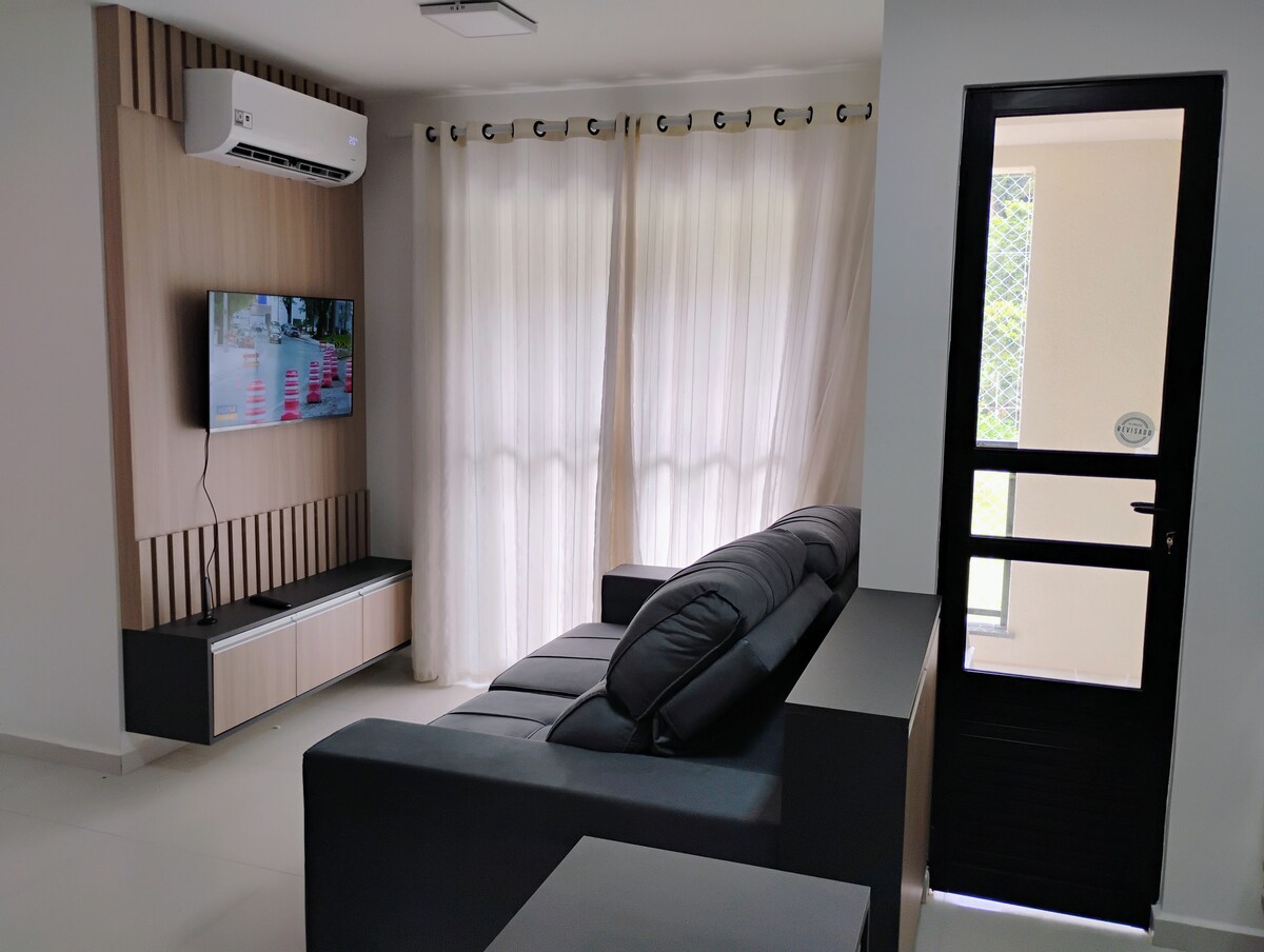 Divirta-se com a sua família neste lugar cheio de estilo, novinho e cheiroso bem próximo à praia. É um espaço bem equipado com 2 quartos com ar condicionado, um banheiro, máquina lava e seca, camas aconchegantes, roupas de cama, toalhas e utensílios de cozinha, tudo para momentos de conforto e descanso. Espaço para suas crianças brincarem e se divertiram na piscina ou em quadra de esportes. Academia com esteira e bicicleta ergométrica. Banheiros auxiliares na área da piscina que ficam próximos.
