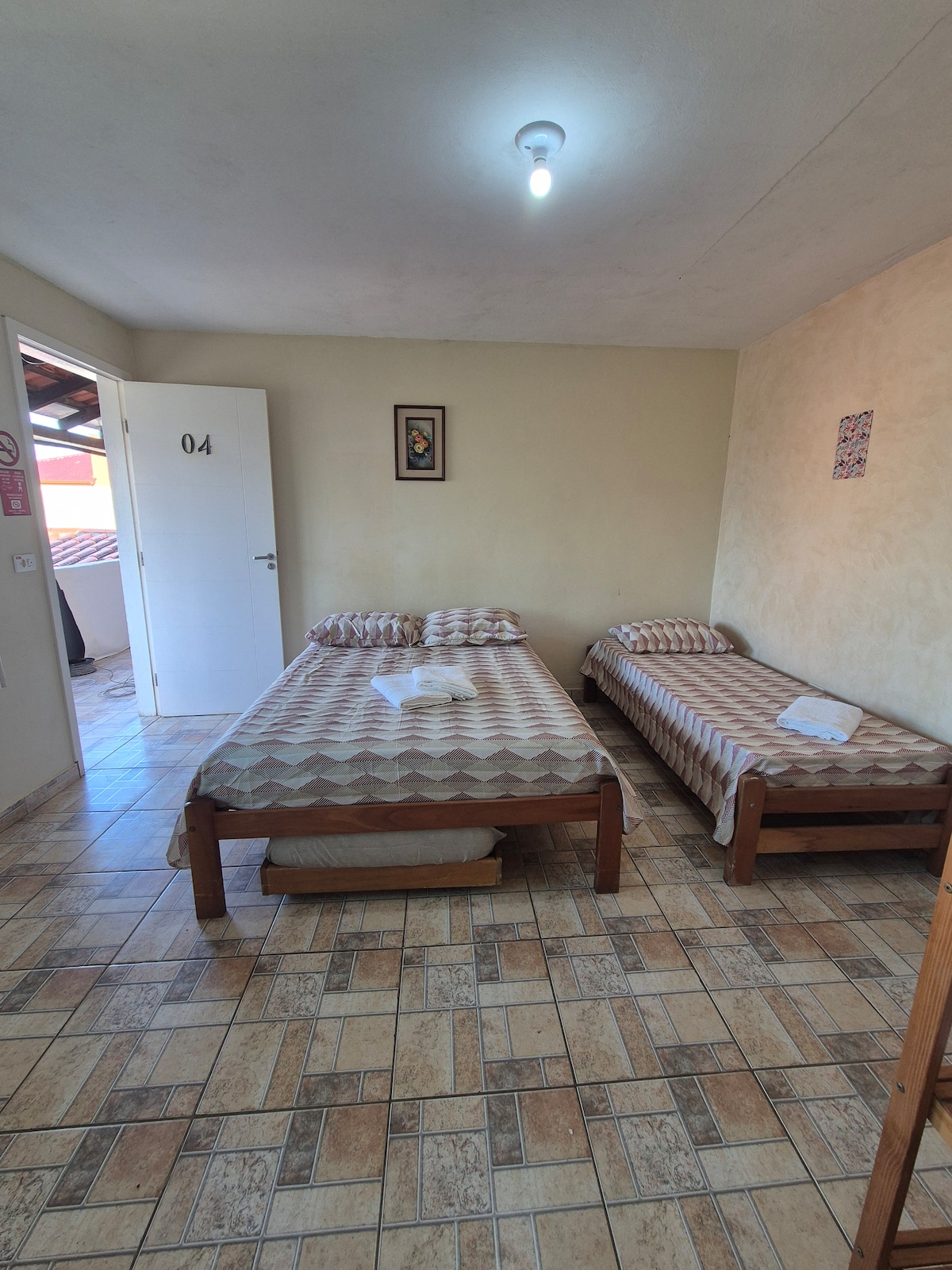 Ampla suíte no Piso Superior, com sacada e vista para morro. Ideal para famílias maiores ou amigos em viagem ! Tranquilidade e sossego para seu descanso ! Dispõe de 1 cama de casal e 3 camas de solteiro.