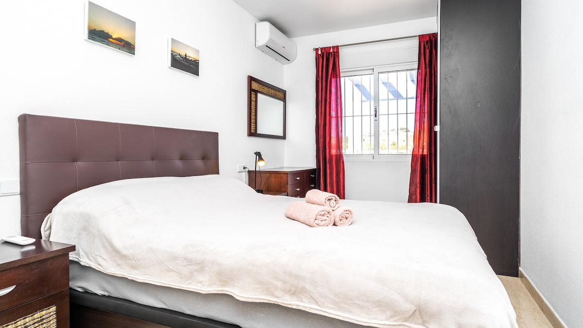 優秀的公寓位於城鎮最理想的街區,車庫內有停車位、空調、300 Mb網路、免費Wi-Fi、智慧電視。 距離細白沙灘和海濱步道僅50公尺。靠近所有服務、Mercadona超市、其他商店、餐廳、酒吧、壯觀的公園「Reina Sofía」和大松樹公園「Alfonso XIII」,可步行或騎自行車,網球場和市政游泳池。