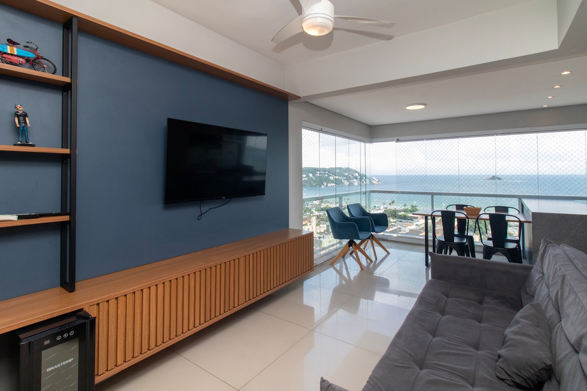400m da Praia da Enseada + vista MAR lindo ! Apê completo com sacada gourmet e churrasqueira! Ar-condicionado, TVs Smart e muito conforto. Condomínio top: lazer, coworking e mercado 24h. Pet friendly, ( mediante a taxa ) Wi-Fi, 2 vagas + kit praia incluso .