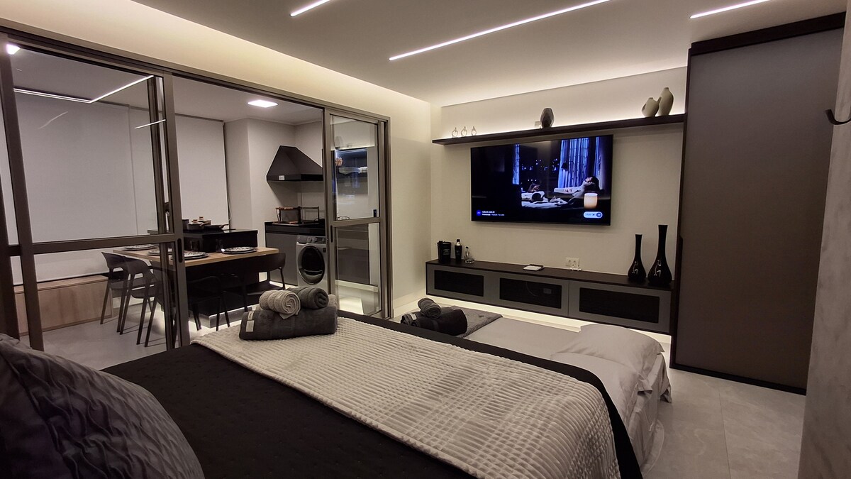 Studio moderno em condomínio de alto padrão com tudo ao seu alcance! hospede-se em um studio completo, dentro de um condomínio sofisticado que conta com um mini shopping cheio de conveniências. Aqui, você encontra de tudo pertinho: farmácia, cafés, restaurante e até mercado 24h ao lado do prédio! Ideal para quem busca conforto, praticidade e segurança, seja a trabalho ou lazer.