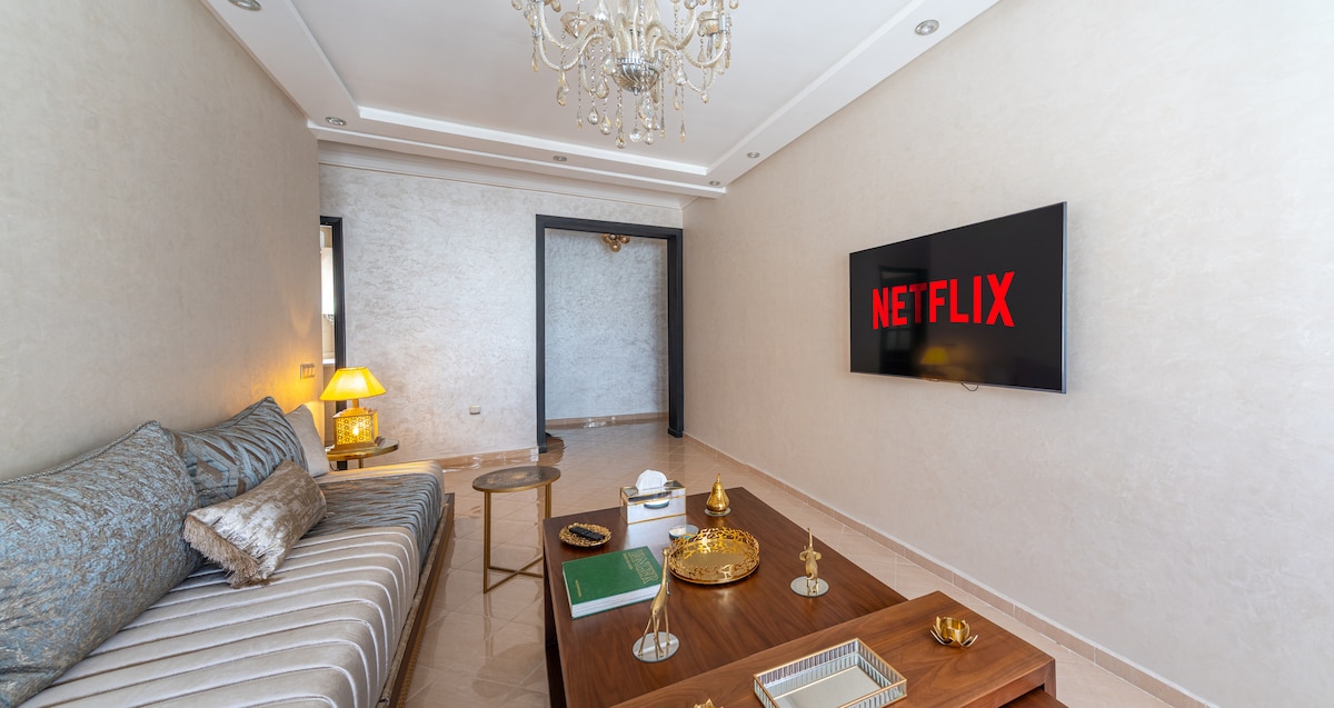 ✨️LE GLORIOUS✨️ Détendez-vous dans ce logement calme et élégant. Joli appartement à deux pas du GRAND STADE de Tanger Agréable et apaisant, l’appartement se compose d’un salon élégant ensoleillé avec une chambre (lit neuf 180) La salle de bain est propre et fonctionnelle Parfaitement équipé, calme et imprégné d'une ambiance cocooning, ce sera le point de chute idéal des voyageurs d’affaires et d’agrément