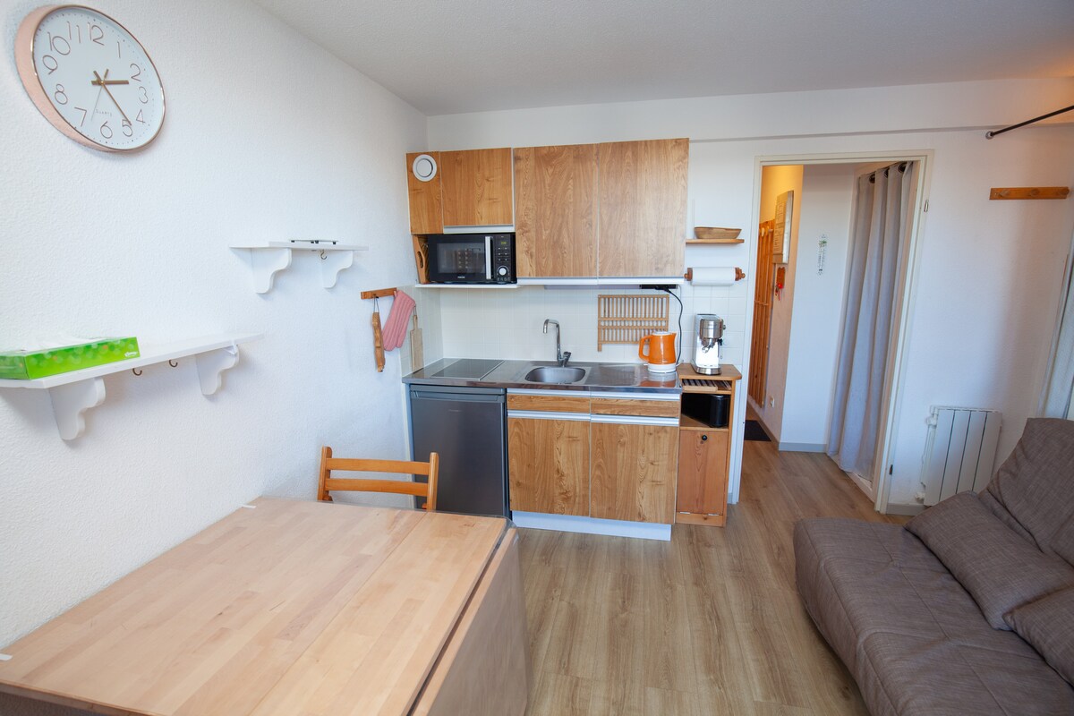 位於度假村中心(Côte Brune 公寓,步行 3 分鐘即可抵達 Jandri Express)的 12 平方公尺單間公寓。 客廳配有 130x190 的沙發床(200x200 的羽絨被 + 2 個枕頭)和平面電視,浴室配有淋浴間、洗手台和廁所。 設備齊全的小廚房、微波爐、烤箱、Senseo 咖啡機。 滑雪用具寄存處。 靠近所有商店。 住宅配有數位密碼鎖。 包含公寓標準清潔服務。 不提供床單和毛巾。