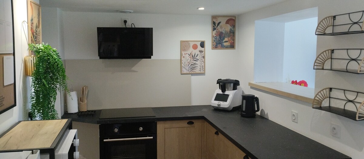舒適的單間公寓,距離中心廣場50公尺,位於安靜僻靜房源的內院中。 它由客廳(沙發、沙發、休閒椅-書桌、咖啡桌)、小廚房(冰箱、微波爐、電磁爐、Nespresso和義大利咖啡機、烤麵包機、茶具... )房間配有140 x 190釐米的牀墊和帶吊馬桶的淋浴間。 使用密碼鑰匙盒自助入住和退房。步行10分鐘即可抵達火車站、Uco、EAG體育場、Lycee。