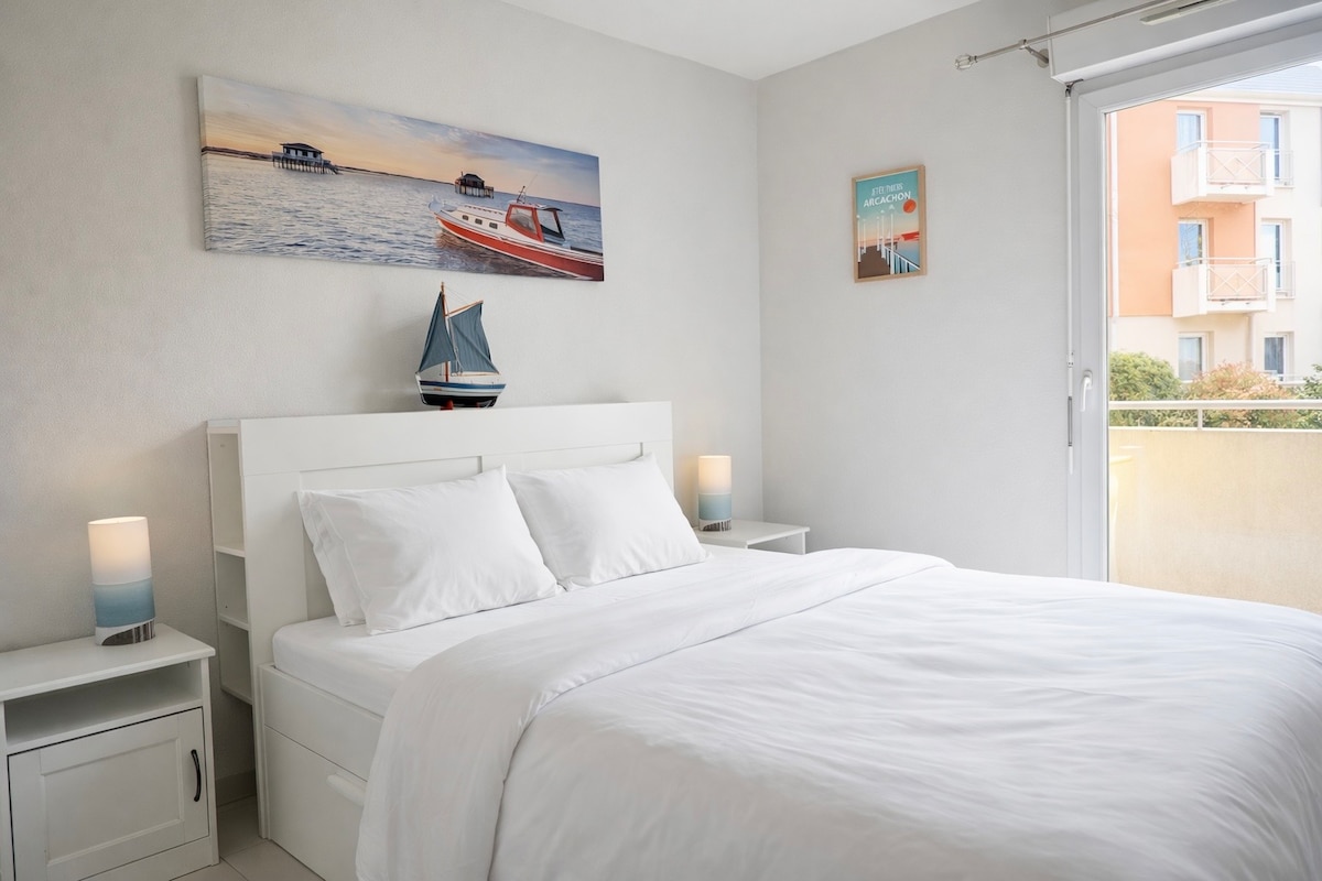 阿卡雄 (Arcachon),位於三樓的豪華兩房公寓,配有電梯和大露台。 美式廚房(見說明)。 廚房後方有一個小島,配有兩張高腳椅,可供用餐。 客廳配有沙發和大螢幕電視。 一間配有大螢幕電視和 160 公分床和 Tempur 床墊的臥室。 浴室配有意大利淋浴間。 配有電動百葉窗的落地窗。 公寓提供免費停車位。 步行 5 分鐘即可抵達海灘、港口和餐廳。WiFi