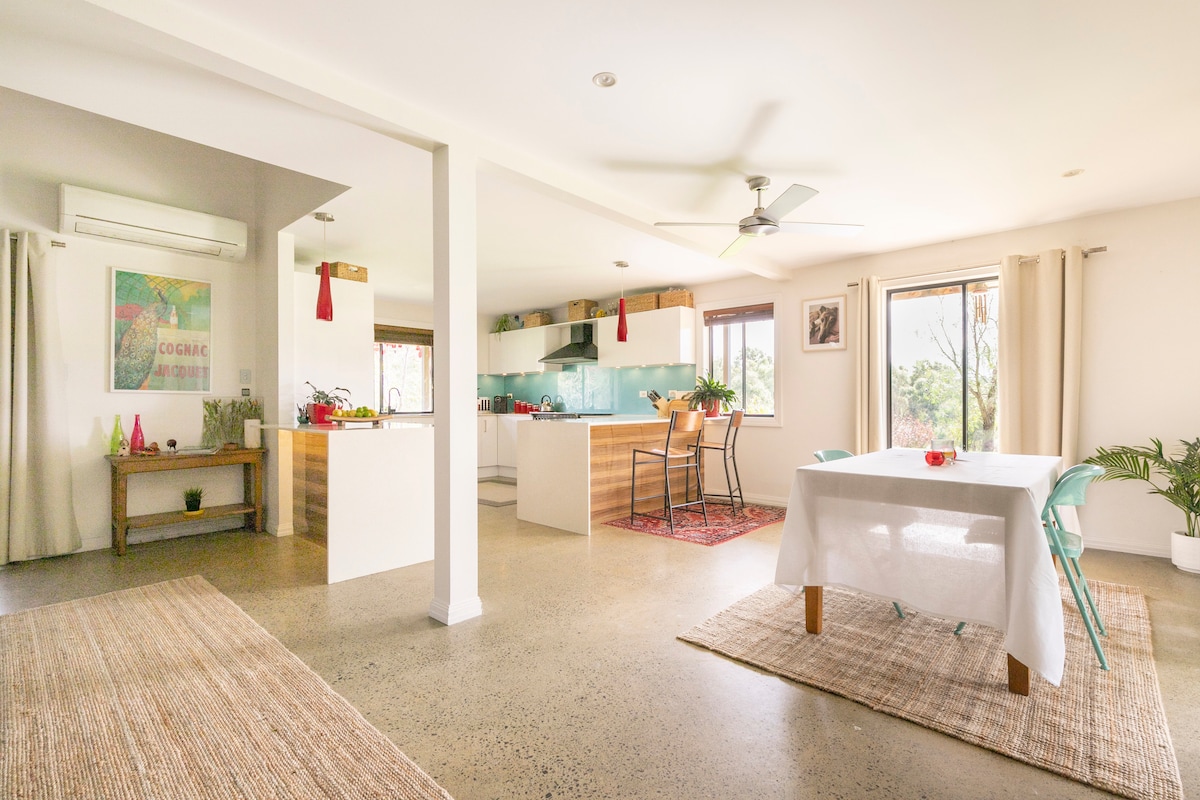 Stay in our spacious loft. NO SMOKING. The apartment is several meters away from the main house, but very private ( this is our residence, we live here). Views to the sea and city. It has an en-suite, kitchenette with sink, bar fridge, induction cooktop, electric grill, convection microwave, Nespresso pod machine and essential items. Pool available. Breakfast provisions and snacks provided. Close to services, hills retreat where you may hear koalas and Kookaburras. Not suitable for children.